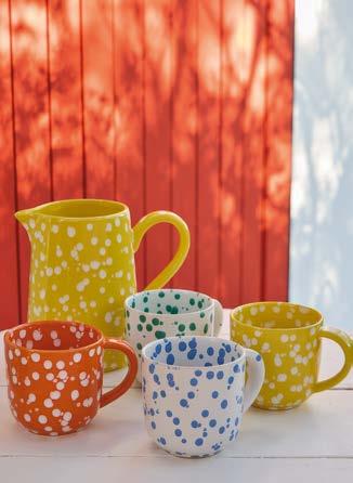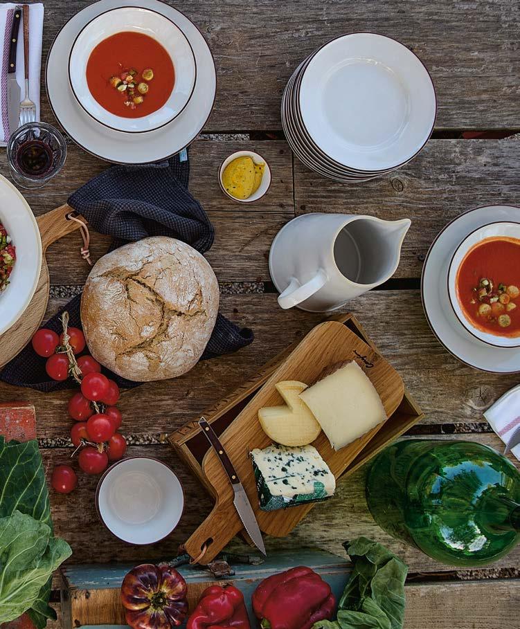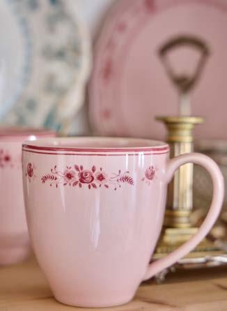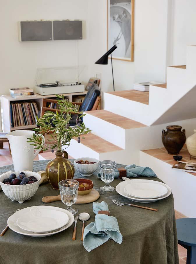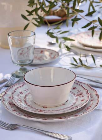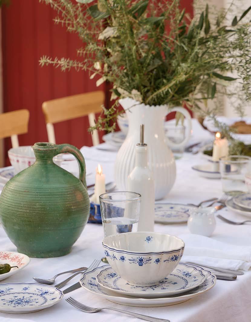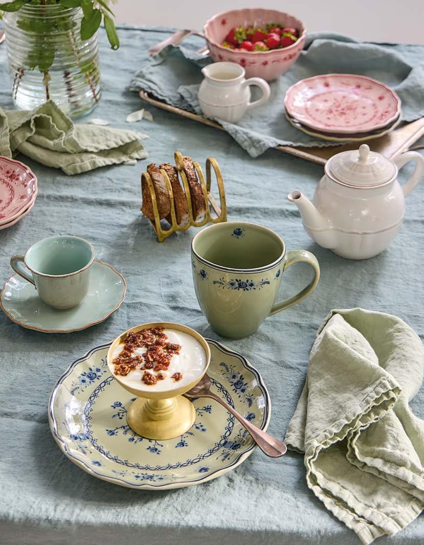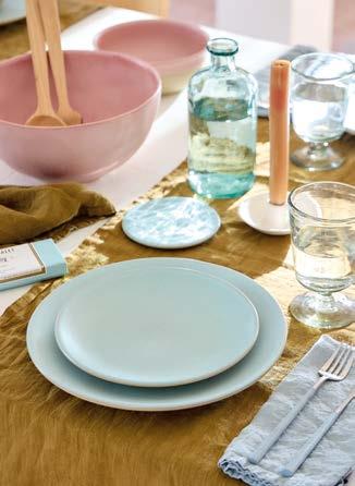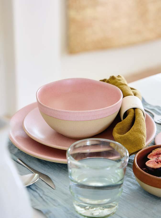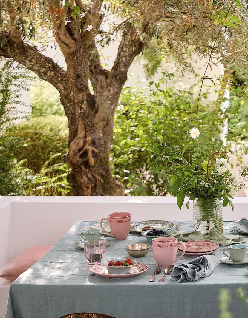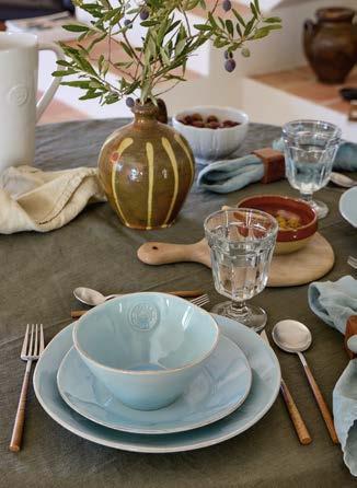 Opposite page: Vila dinner plate 27 in beige-blue, salad/dessert plate 21 in olive-blue and appetizer plate 17 in pink-red with Nau cutlery in antique brown, Sensa tumbler 30 cl and coupe glass 21 cl in pink magnolia, and Maria napkin in lily green. Above, top to bottom: Vila mug 41 cl in pink-red. Vila soup/cereal bowl 16 in olive-green and Alentejo soup/cereal bowl 16 in turquoise.