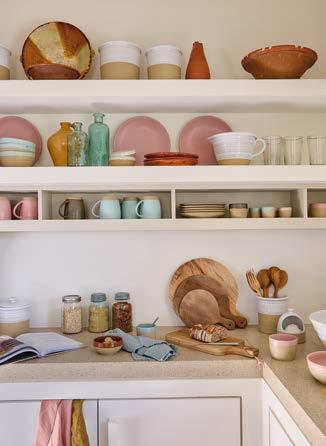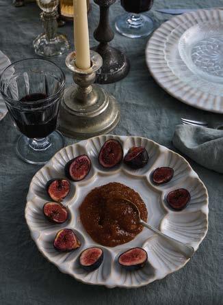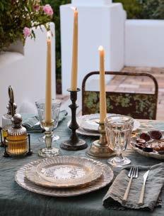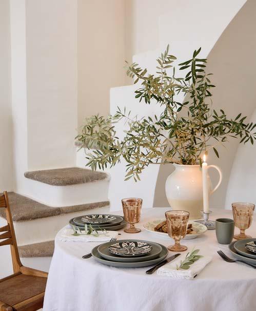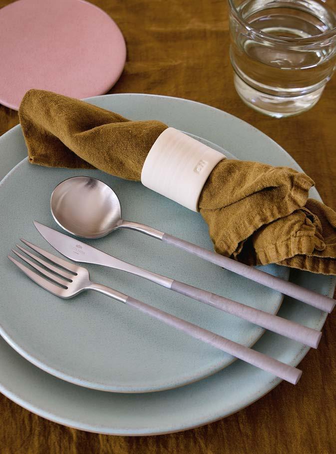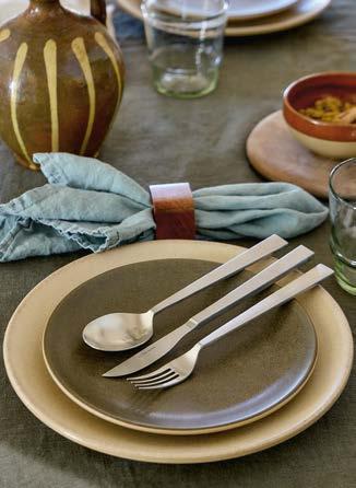 Above: Nau cutlery in antique brown and Maria napkin in lily green. Opposite page: Vila and Rosa stoneware collections with Sensa glassware and Maria linens collection.