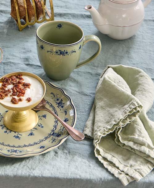 Above: Vila salad/dessert plate 21 and mug 41 cl in olive-blue with Nau dessert spoon in antique brown, and Maria linens in mint and lily green.