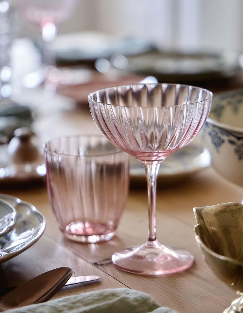 Opposite page: Sensa coupe glass 21 cl in pink magnolia. Above: Sensa coupe glass 21 cl in bottle green, turquoise, pink magnolia and smoked grey.