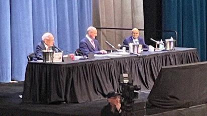 Warren Buffett, Greg Abel, and Ajit Jain at the Q&A session