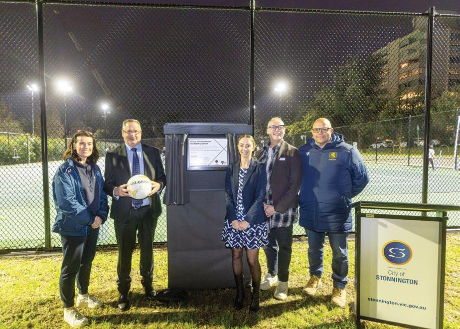 ↖ (Pictured L-R) Kate Campbell from Stonnington City Netball Association, John Berger MLC, Stonnington Mayor Cr Jami Klisaris, Cr Mike Scott and Tyrone Landsman from Melbourne Rugby Club at the unveiling of the new courts.