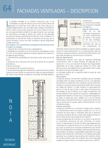 infiltraciones). Los elementos funcionales que componen la fachada ventilada son: Capa de soporte mural Puede ser de tipo monocapa, compuesta por una única estratificación de material, o bien puede ser de tipo multicapa, esencialmente constituido por más de una estratificación de materiales. Según el tipo de material empleado, la capa de soporte influye de modo determinante en el comportamiento total del sistema, a causa de los diversos coeficientes de deformación a los que están sometidos los elementos que lo componen. Capa de regularización Generalmente presente como capa de argamasa distribuida uniformemente sobre la pared (revoque de argamasa de un espesor de 1-2 cm.), con la función de reducir las irregularidades superficiales de la capa situada por debajo. De hecho, para permitir una correcta aplicación de la capa aislante sobre la capa de soporte, tiene que ser llevado a cabo ¬ un esmerado análisis de su superficie desde el punto de vista geométrico y físico. Capa aislante Los paneles aislantes comúnmente empleados para las fachadas ventiladas tienen un espesor variable de 3 a 8 cm. y son aplicados directamente al soporte del muro mediante colas y/o elementos mecánicos. La elección de los materiales de fijado está en función del estado del edificio. El fijado mecánico es particularmente apto en el caso de que se lleve a cabo sobre reconstrucciones de fachadas, ya que el adhesivo no es capaz de garantizar una perfecta adhesión sobre superficies irregulares y degradadas por los agentes atmosféricos. En todo caso, si se usan tacos expansivos de fijado, se tendrá que tener cuidado con el uso de material plástico para evitar puentes térmicos. En presencia de edificios de nueva construcción se pueden aplicar indiferentemente los dos métodos de anclaje. Capa de ventilación La capa de ventilación es un intersticio situado entre el aislante y el revestimiento externo, de espesor variable de 3 a 5 cm. La formación de dicha capa es importante para que se garantice una buena circulación del aire y, sobre todo, pueda provocarse el efecto chimenea (tiro hacia arriba del aire caliente). La tarea fundamental del intersticio es, por tanto, la de permitir un movimiento ascensional del aire, ofreciendo un confort térmico. Evidentemente la función de dicha capa depende de las condiciones de circulación del aire en su interior, por lo que hay que evitar la presencia de eventuales impedimentos que limiten dicho flujo (estrangulamientos debidos a la presencia de elementos estructurales o de anclaje, irregularidades superficiales de la capa aislante y del material de revestimiento, etc.). Además, para poder garantizar una ventilación natural dentro del intersticio, tienen ser siempre previstas rejillas de ventilación de sección adecuada situadas en la parte inferior y en la parte superior de un edificio.