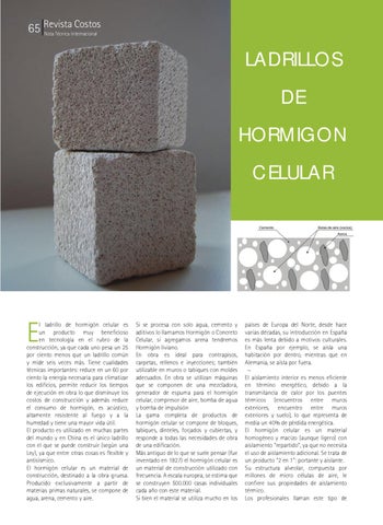 l ladrillo de hormigón celular es un producto muy beneficioso en tecnología en el rubro de la construcción, ya que cada uno pesa un 25 por ciento menos que un ladrillo común y mide seis veces más. Tiene cualidades técnicas importantes: reduce en un 60 por ciento la energía necesaria para climatizar los edificios, permite reducir los tiempos de ejecución en obra lo que disminuye los costos de construcción y además reduce el consumo de hormigón, es acústico, altamente resistente al fuego y a la humedad y tiene una mayor vida útil. El producto es utilizado en muchas partes del mundo y en China es el único ladrillo con el que se puede construir (según una Ley), ya que entre otras cosas es flexible y antisísmico. El hormigón celular es un material de construcción, destinado a la obra gruesa. Producido exclusivamente a partir de materias primas naturales, se compone de agua, arena, cemento y aire.
