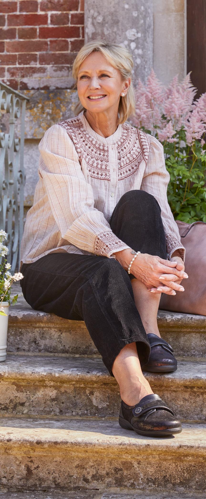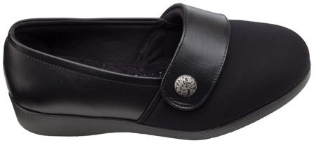 Discreet touch-fastening strap, disguised with a decorative button, hides a fabric gusset which gently stretches to accommodate swollen feet with ease