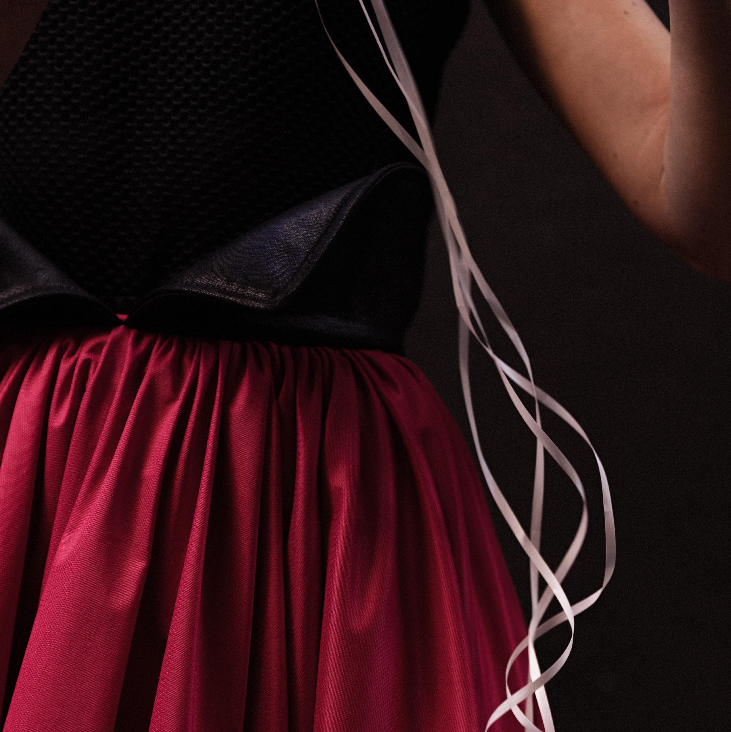 Beautiful red gown. Handmade. Unique two shaded red doubled polyester fabric. Black nappa details. Black tulle underskirt.