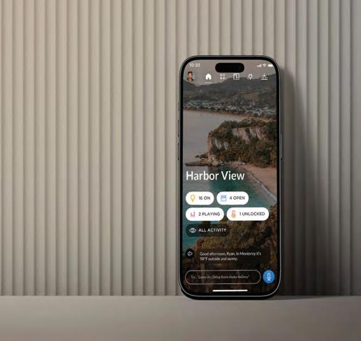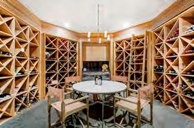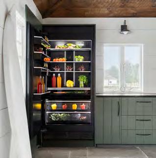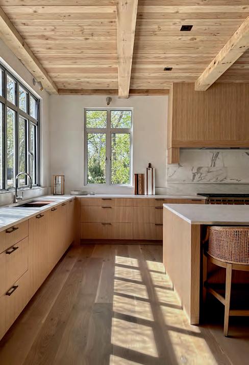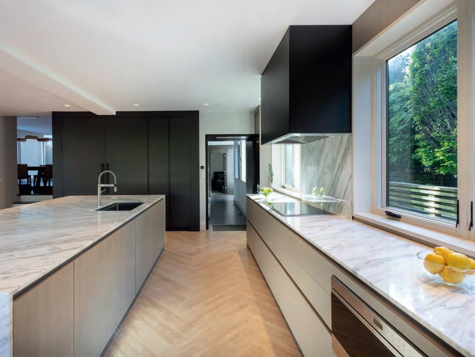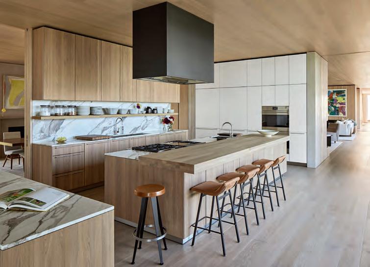This kitchen design seamlessly blends sophistication and functionality. Minimalist cabinetry, a neutral color palette and metallic accents create an elevated modern aesthetic. Highcaliber materials such as marble and matte-finished wood enhance the sleek design of the countertops and cabinets. The countertop’s marble gracefully extends into a wooden breakfast table at the island’s edge, creating a harmonious balance of natural elements, while highlighting their distinct textures. Large windows allow natural light to stream in, which creates a warm, inviting ambiance. Complete with Sub-Zero appliances, all elements of the kitchen—from the handle-less cabinets to the dramatic marble countertops and wood finishes—come together in an elegantly designed display of contemporary kitchen design.