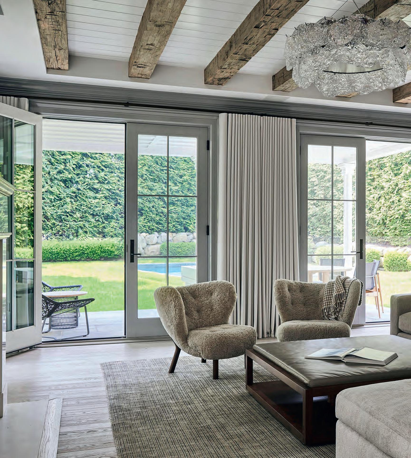 two pairs of club chairs, but upholstered with a vibrant striped performance fabric, as well as a rug that can easily absorb wet guests right from the swimming pool. The homeowner, who has worked on prior projects with Cunningham, says, “Décor wise, I just think Mark is the most talented designer out there today. There’s nobody who can compose a room the way he does. He made the barn comfortable, yet refined and family-friendly.”