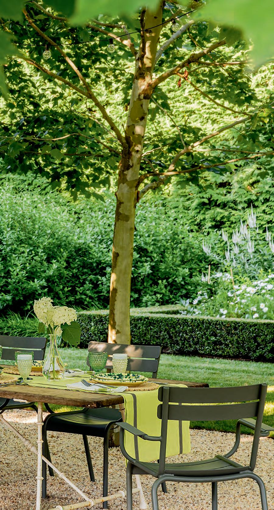 Stylish Setting Chairs from Fermob surround a vintage French table in the outdoor dining area. The plates are from March. See Resources
