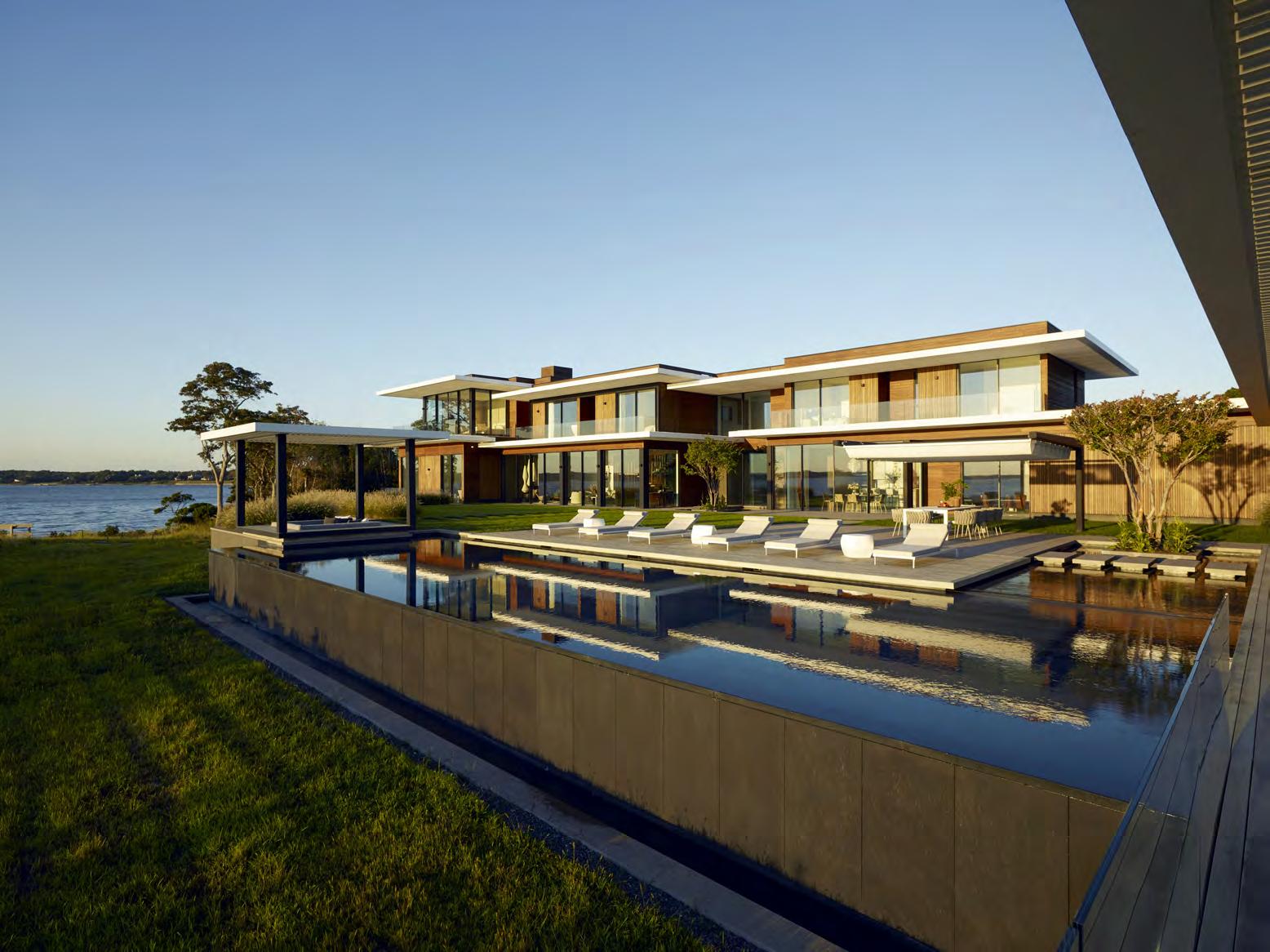 Rising between a saltwater pond and the Atlantic Ocean, the “Seascape Residence” was elevated ten feet above grade to comply with FEMA regulations. Innovative stormwater management addresses the site’s complex hydrology and high-water table by employing strategically placed rain gardens that double as flood mitigators and a habitat for native pollinators. The design seamlessly blends with nature, minimizing traditional lawn space to enhance biodiversity and conserve water. Terraced steps and decking connect the raised residence with its surroundings, offering outdoor living spaces with an infinityedge pool, fire table and al fresco dining.