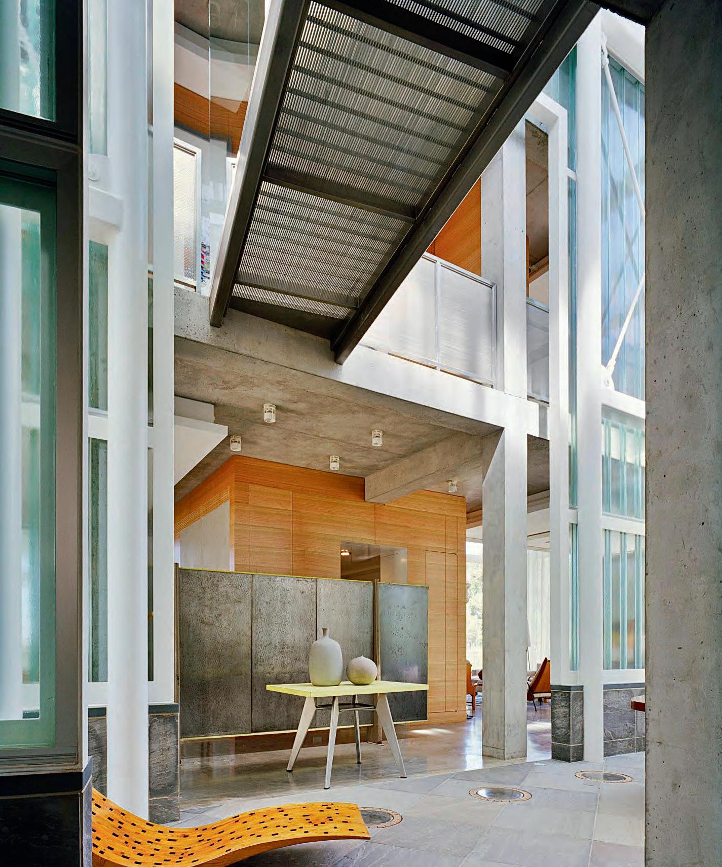 On a waterfront site, the goal was to design a residence that takes advantage of views of the bay while bringing light into the building. The structure houses a collection of furniture and objects by 20th-century architects and artists. To experience the views of the water to the North, while allowing light from the front South exposure, the concrete structure is broken open like a cracked egg. An independent structural channel glass wedge acts as an infill object that reaches up above the concrete structure and grabs the light from the South like a lighthouse lantern.