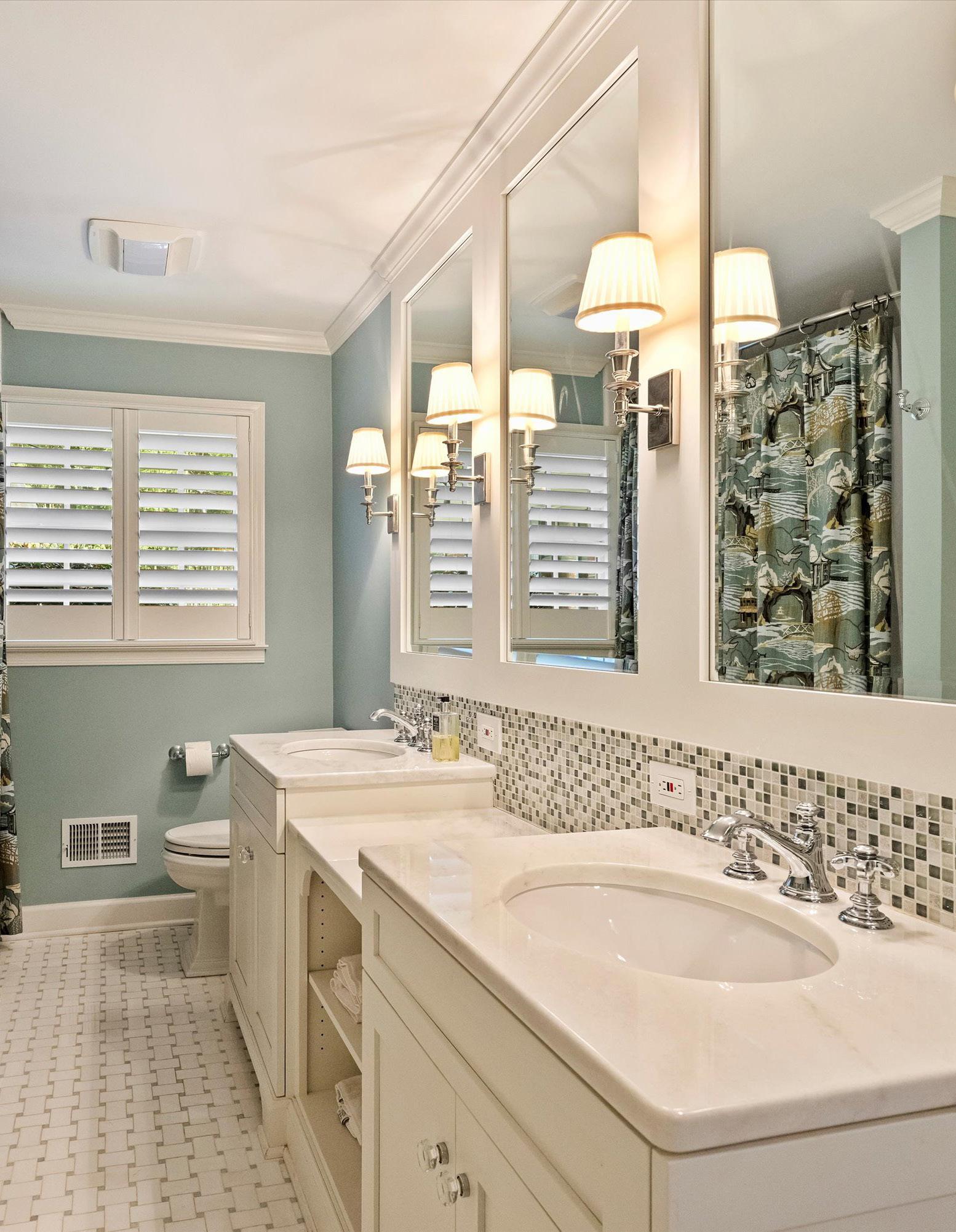 • Remodeled hall bath with marble floor and marble countertops; added subway tile to bathtub surround; added custom cabinetry under countertops with open shelves; added large cabinets with custom glass and large drawers underneath offering substantial storage. Mirrors have custom wood surround.