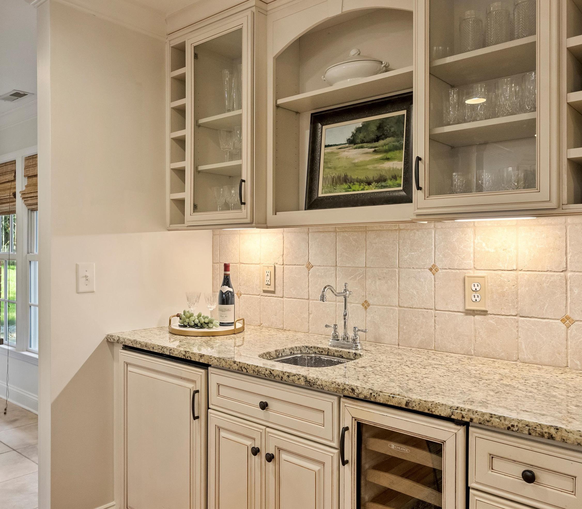 • Added a wet bar with hammered sink including cabinetry matching kitchen; including wine rack, wine cooler and refrigerator/granite countertops