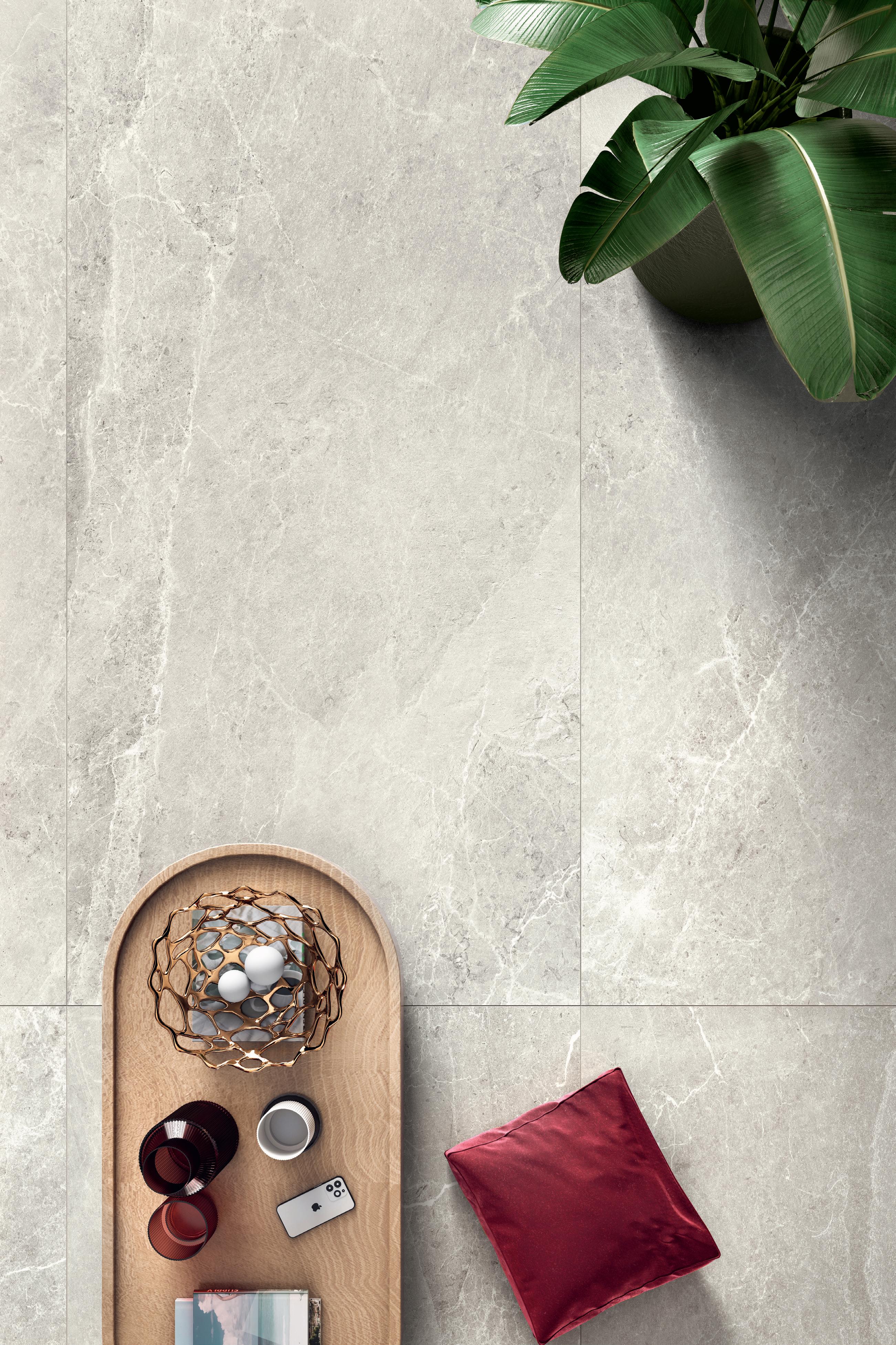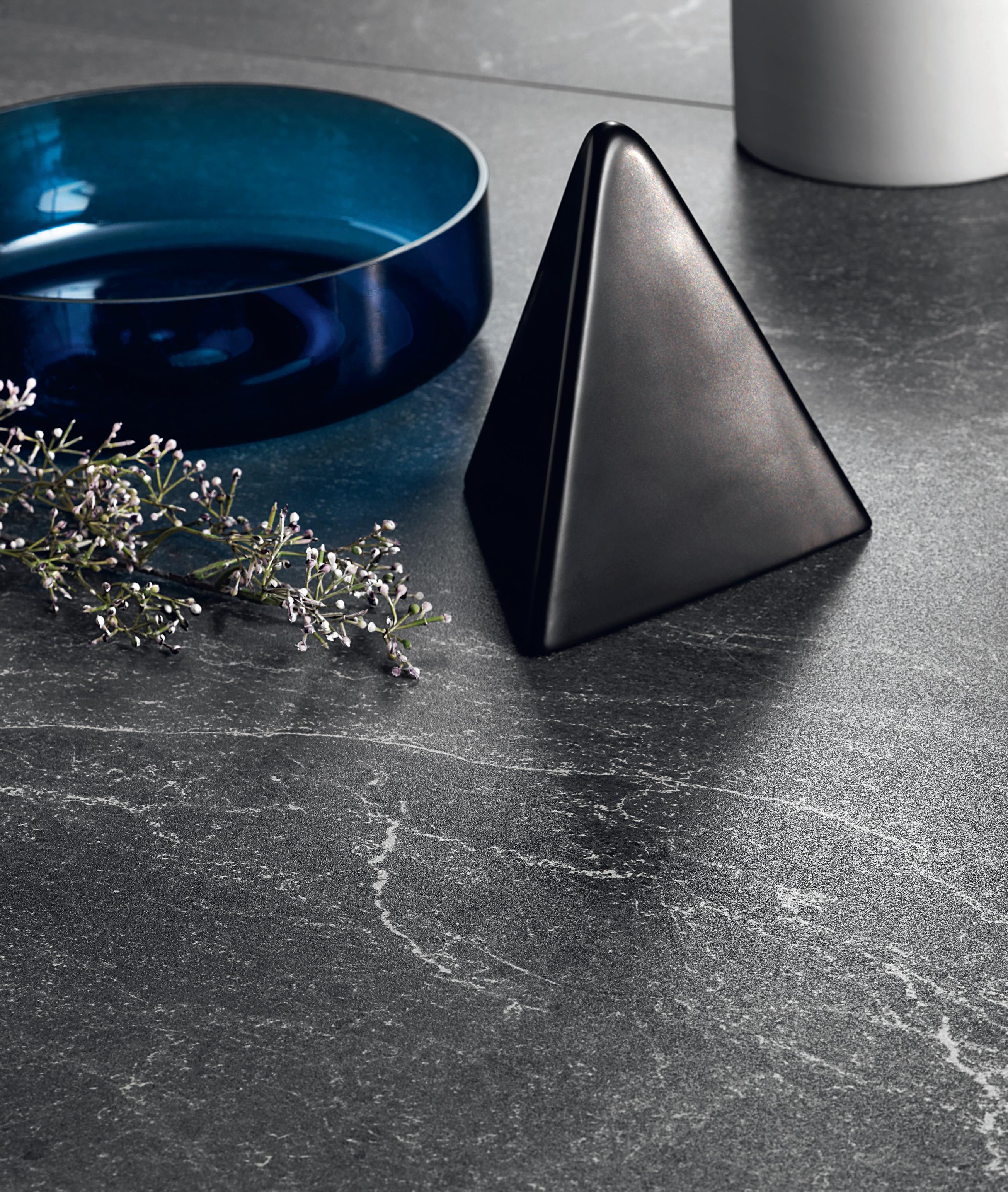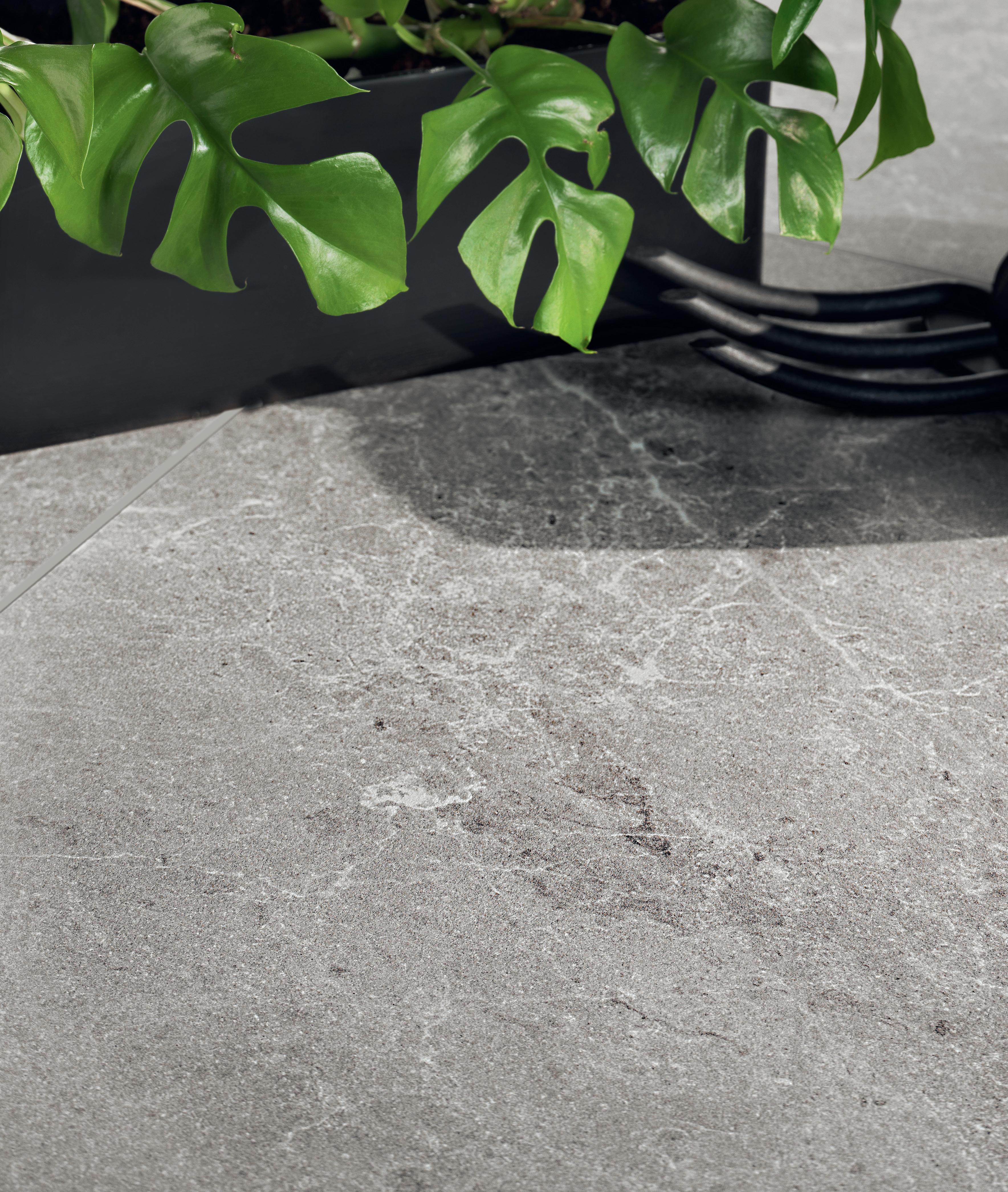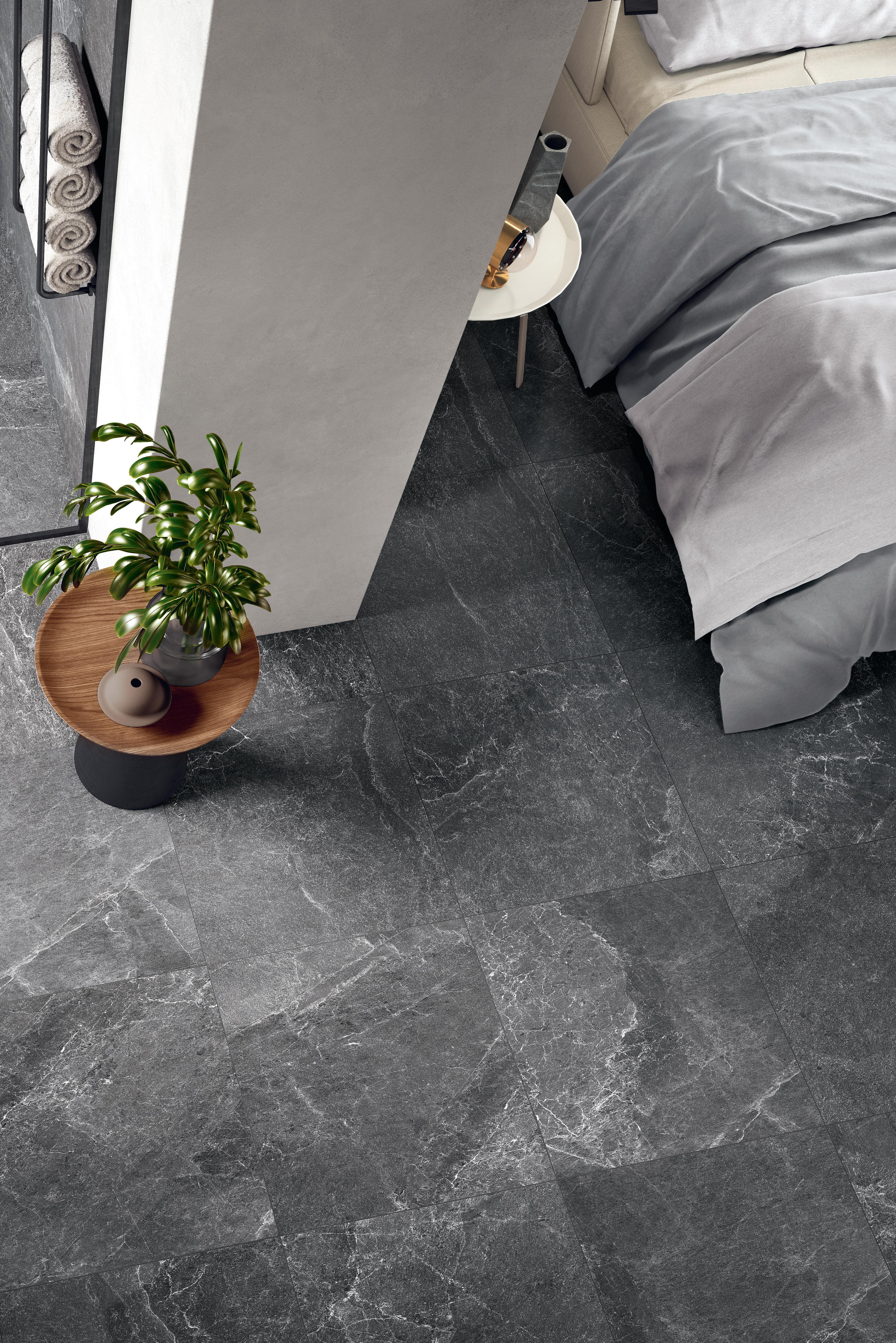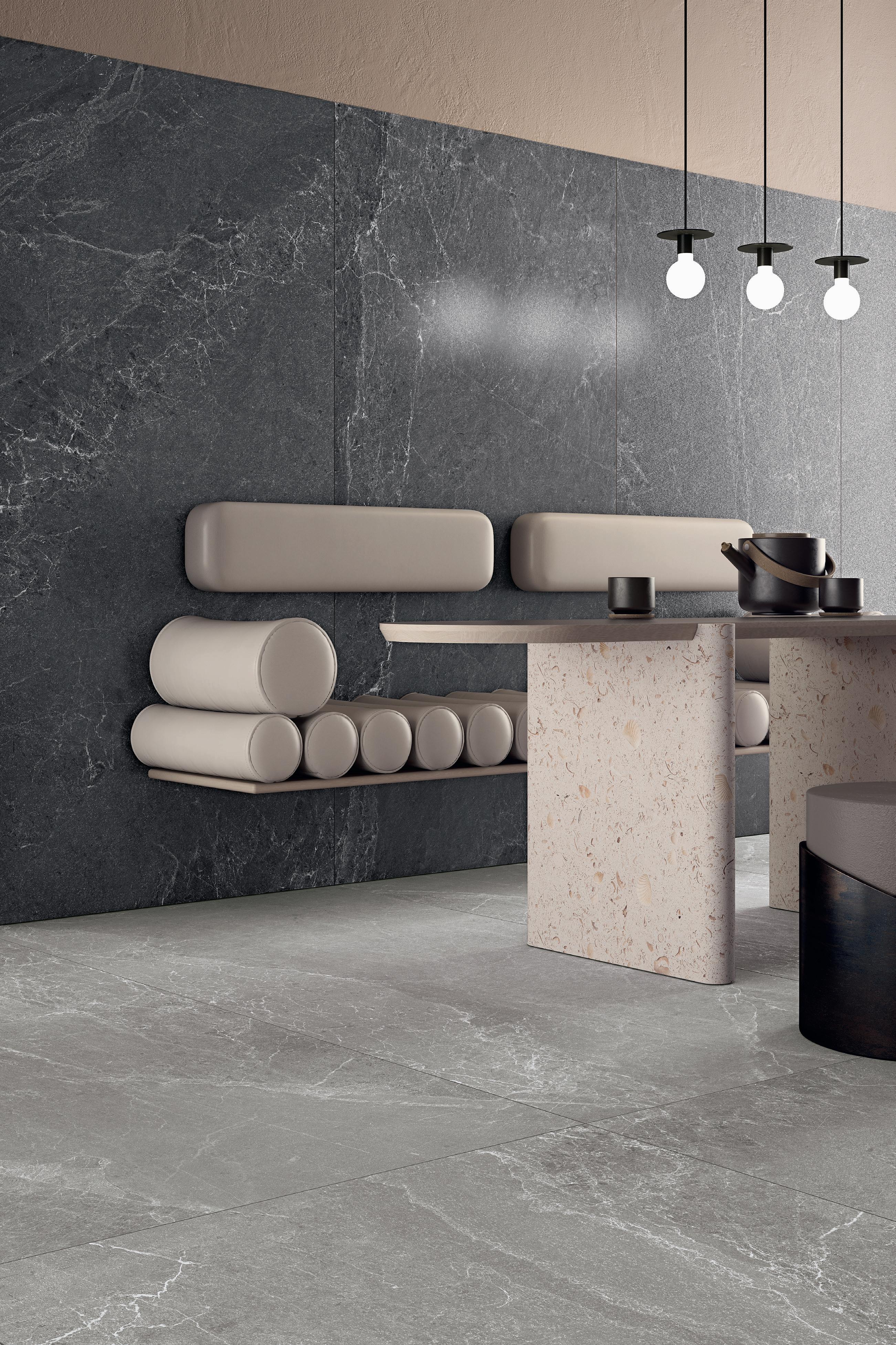 Woven together into a single and elegant fabric, multiple textures come together, derived from various natural stones: distinct marble filigree and granular inclusions typical of limestone are grafted onto a classic slate surface. The result is a stone-look shaped by modern sensibility: a synchronicity that goes beyond taste and aesthetics, ultimately creating a vision of tangible spaces in which to experience this striking communion between beauty and quality.