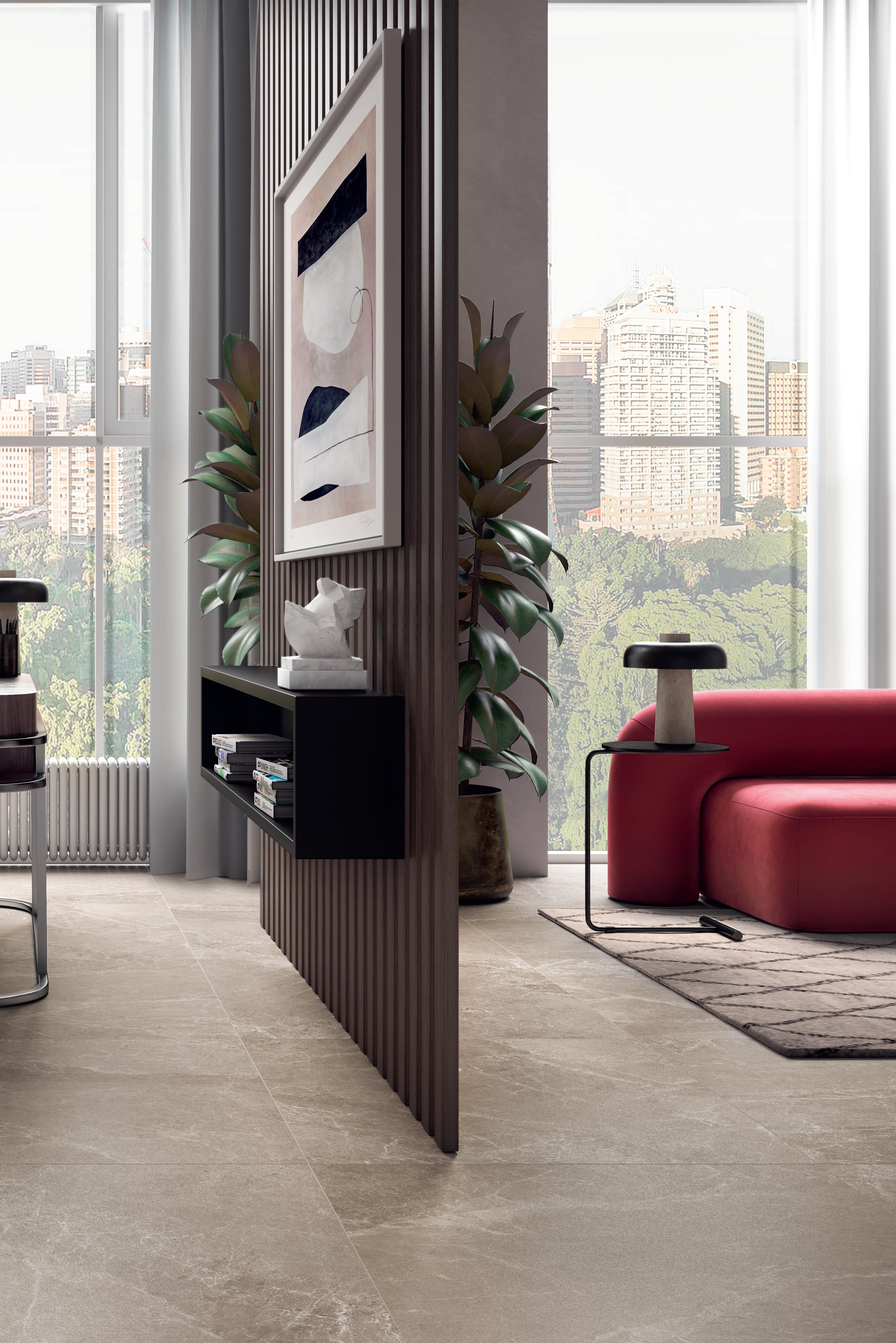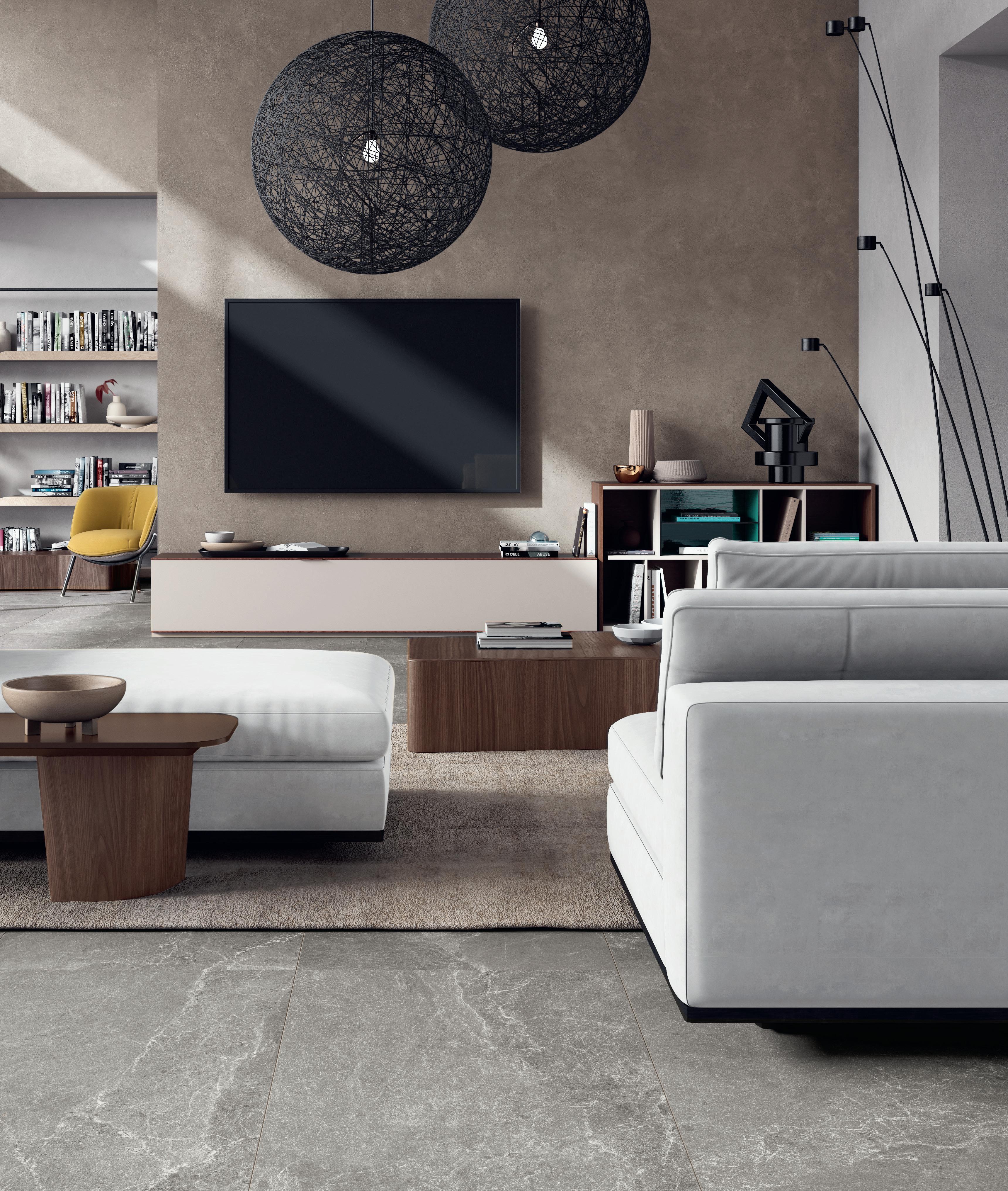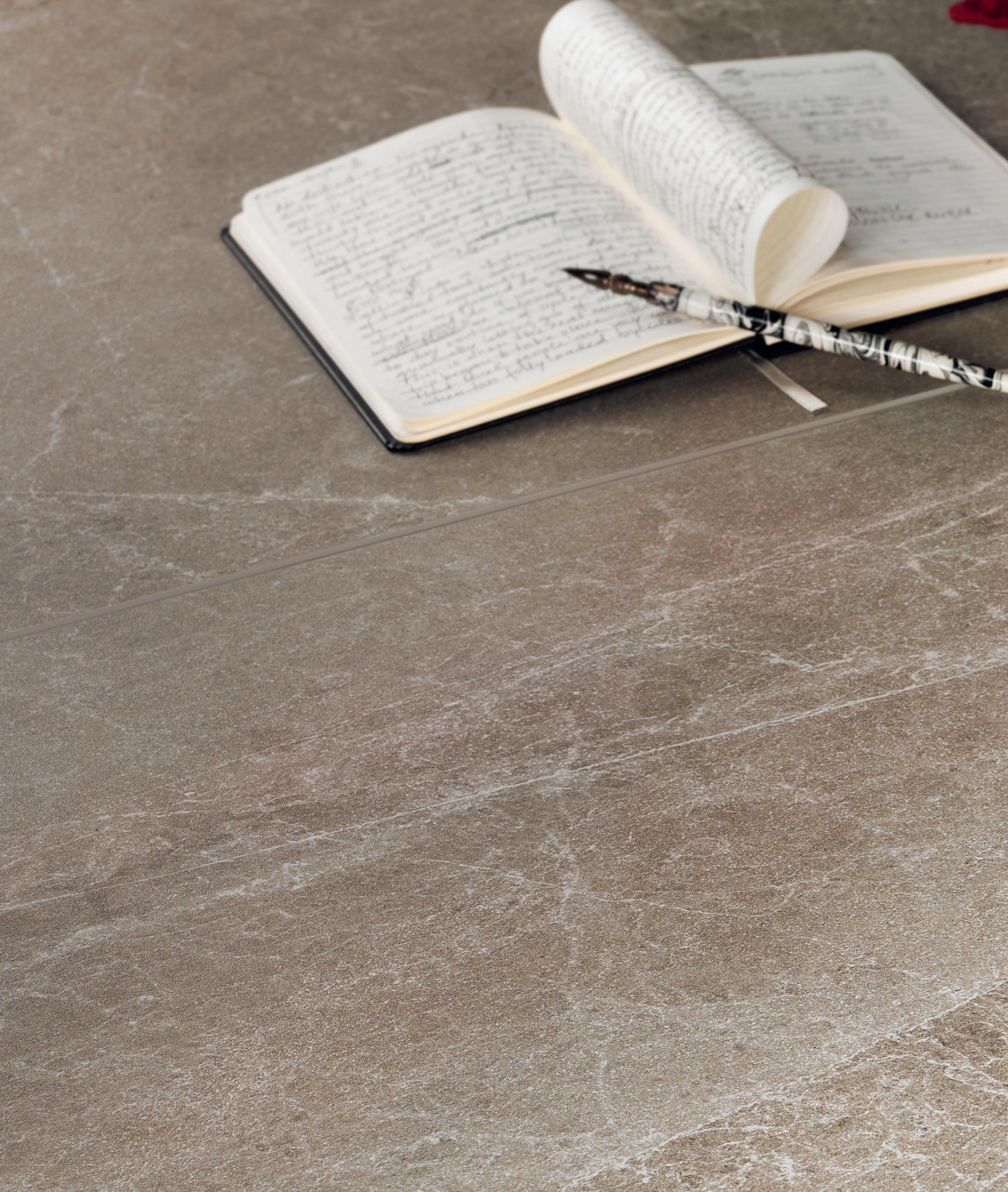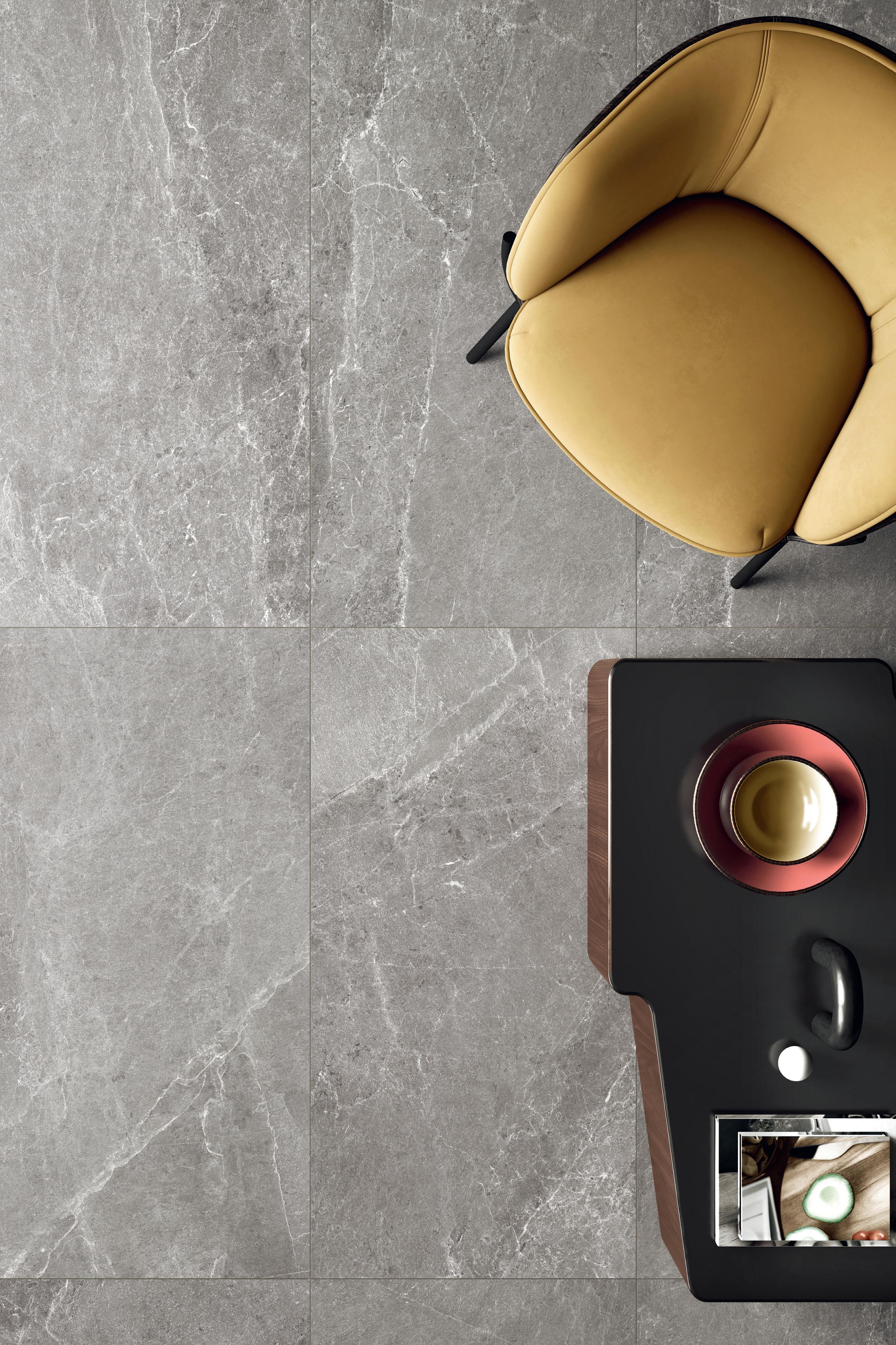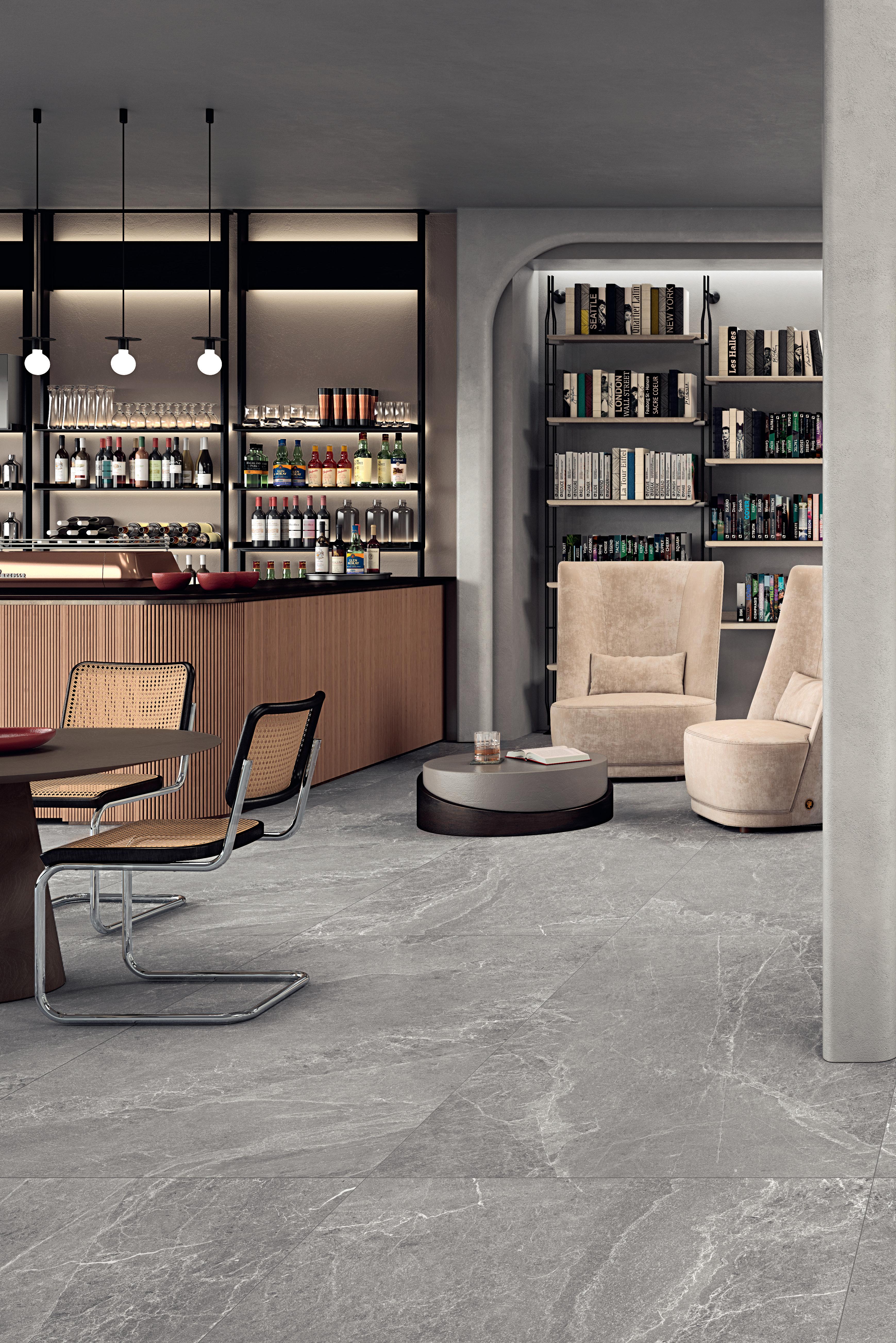 Woven together into a single and elegant fabric, multiple textures come together, derived from various natural stones: distinct marble filigree and granular inclusions typical of limestone are grafted onto a classic slate surface. The result is a stone-look shaped by modern sensibility: a synchronicity that goes beyond taste and aesthetics, ultimately creating a vision of tangible spaces in which to experience this striking communion between beauty and quality.