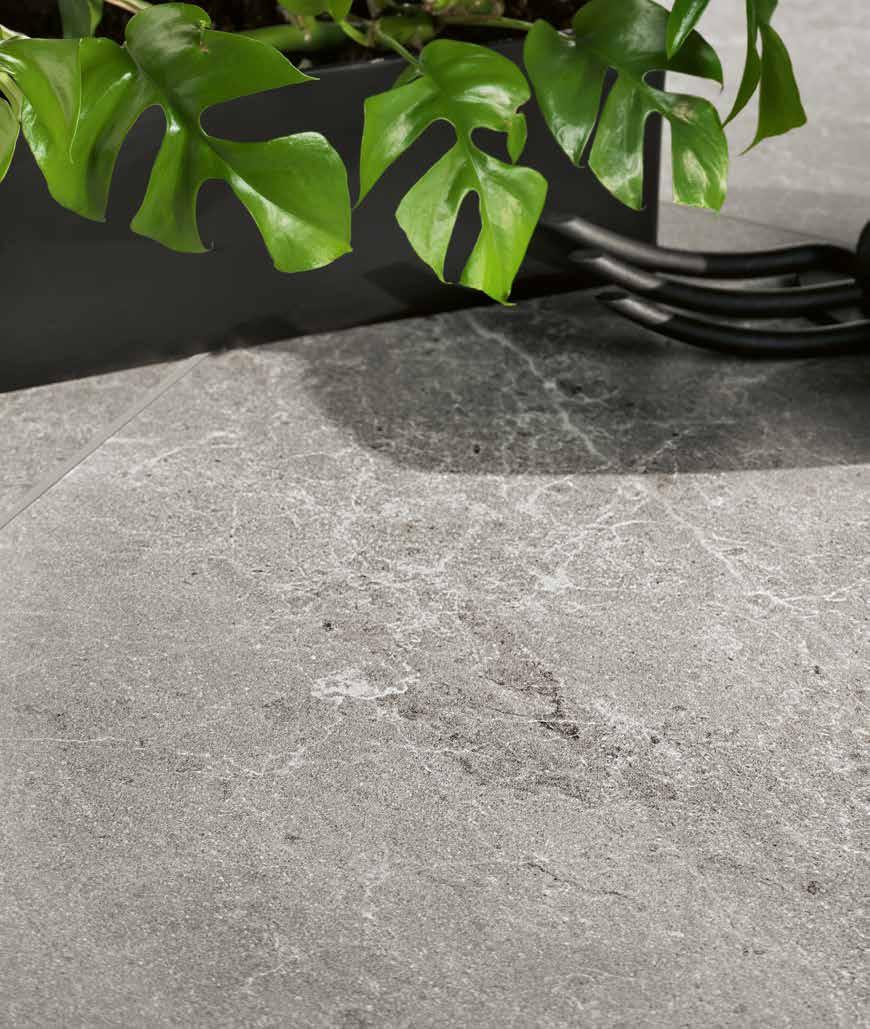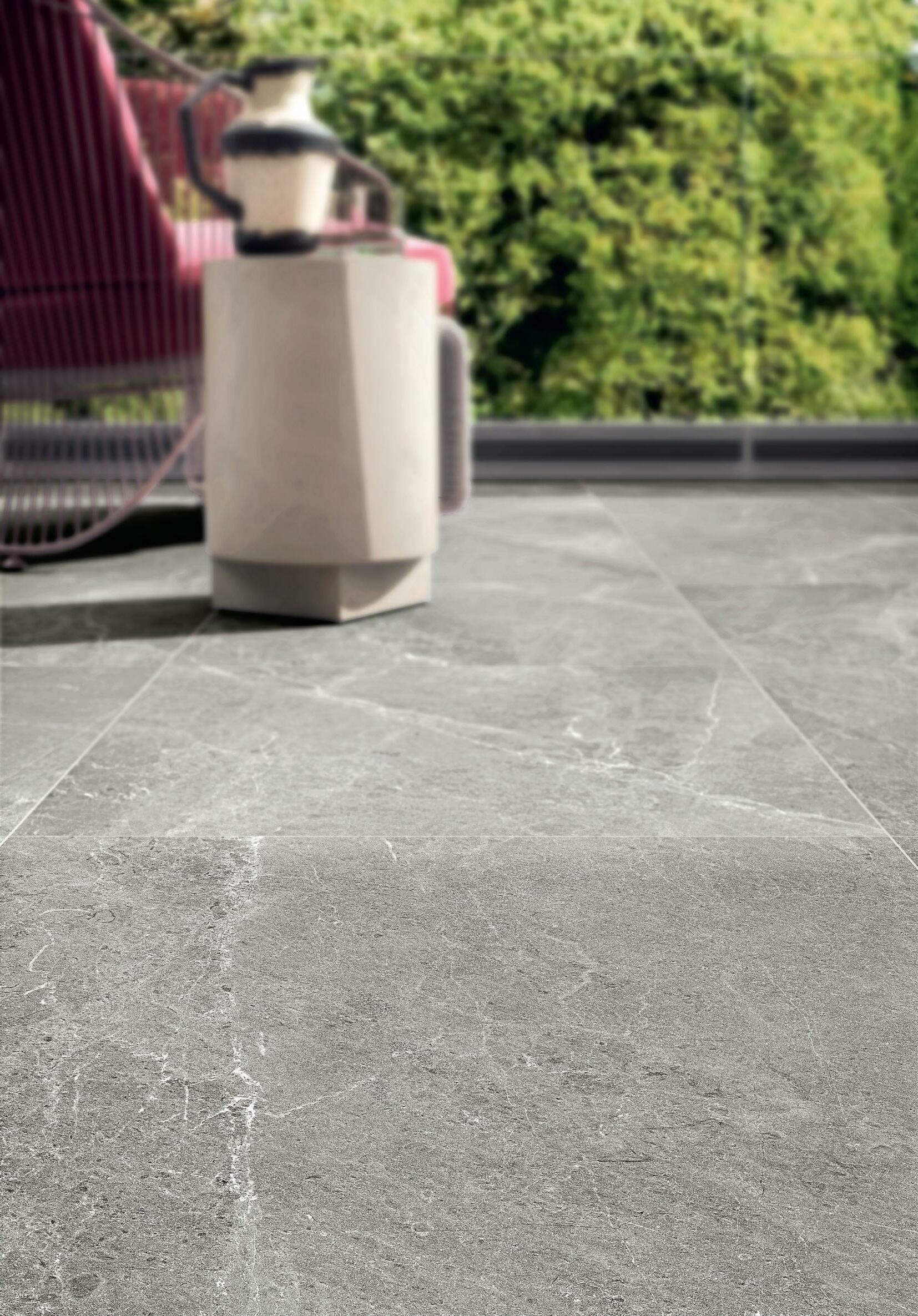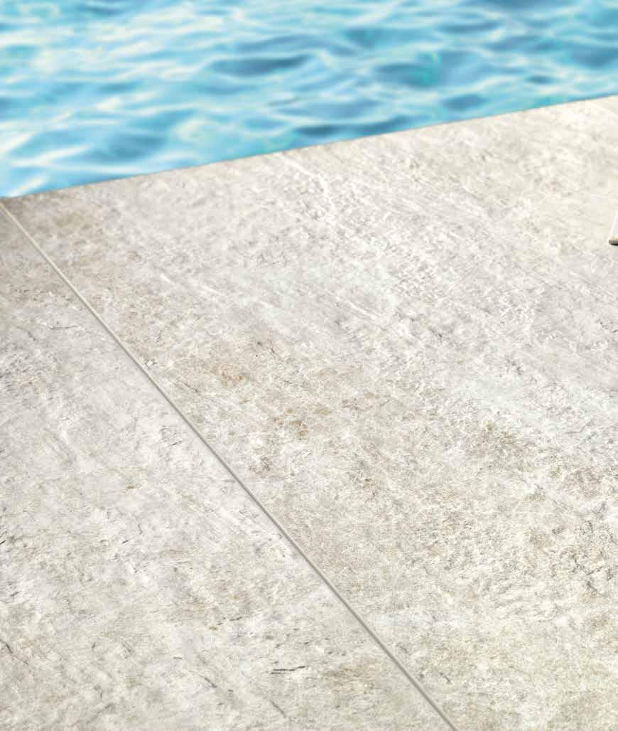 This finish recalls the surface of slate, which features a characteristic ruggedness that highlights the natural appearance and maximises the product’s anti-slip performance (R12C). The surface characteristics and increased thickness (20 mm) make this the perfect material for high-end outdoor contexts, in which the best technical performance must be accompanied by the highest aesthetic standards.