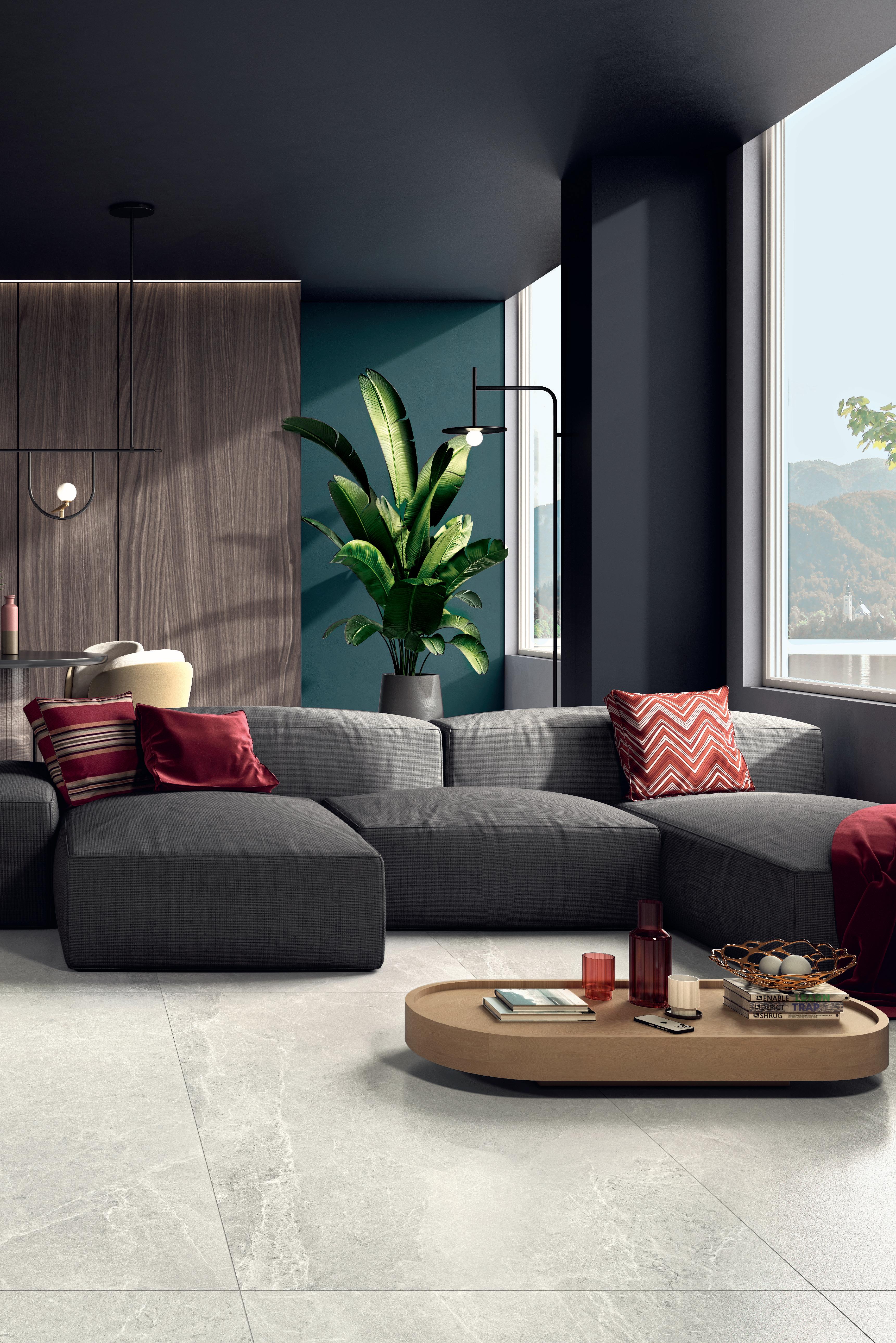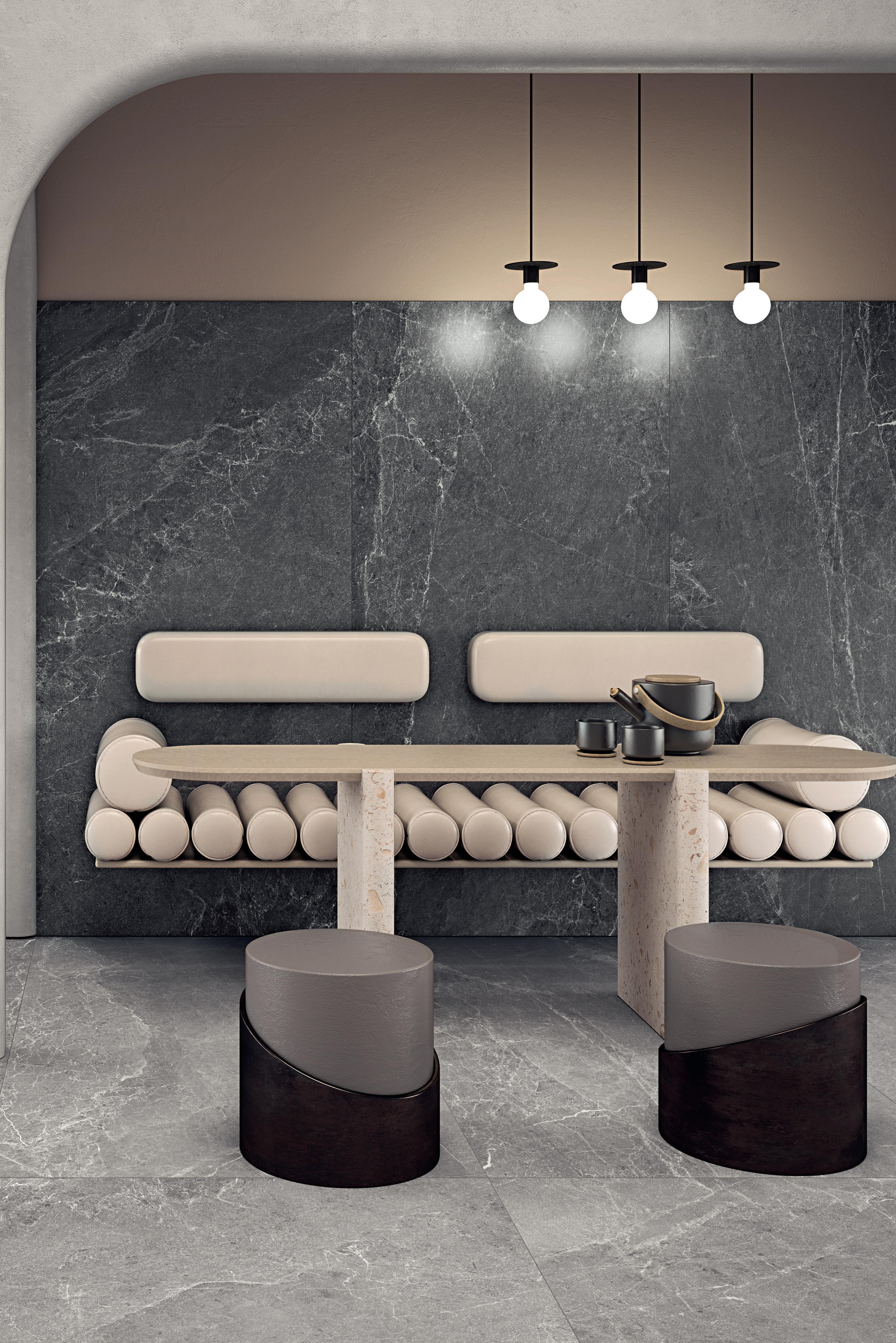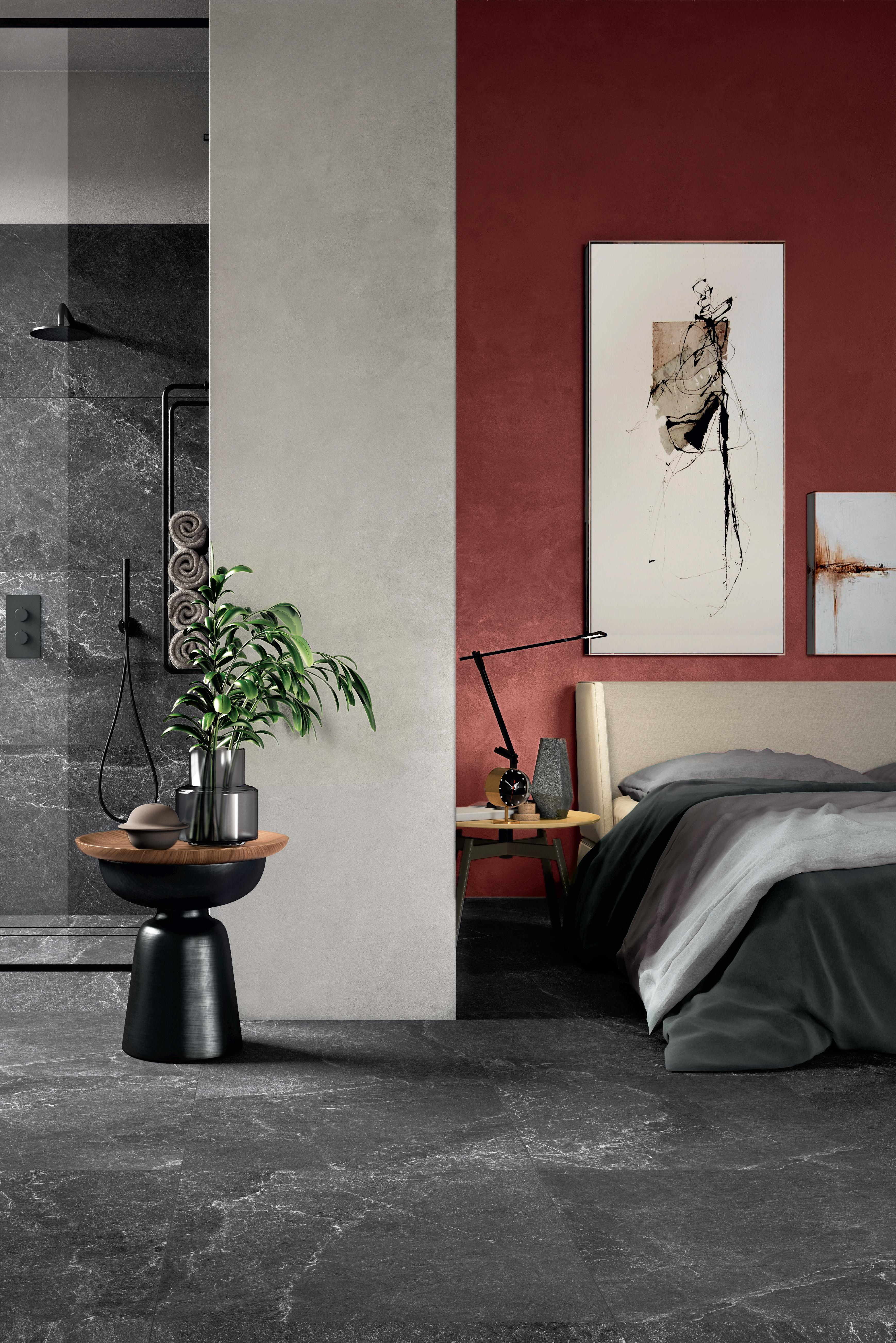 When it meets the marble veining, the strong character of slate becomes refined; the grain typical of limestone emerges in the form of sophisticated punctiform concretions. The various finishes make it possible to admire continuously new aspects of this expressive graphic texture, offering vivid tactile and visual sensations. The final stone-look is contemporary and trendy, featuring a multitude of mineral impressions that harmonise beautifully with one another.