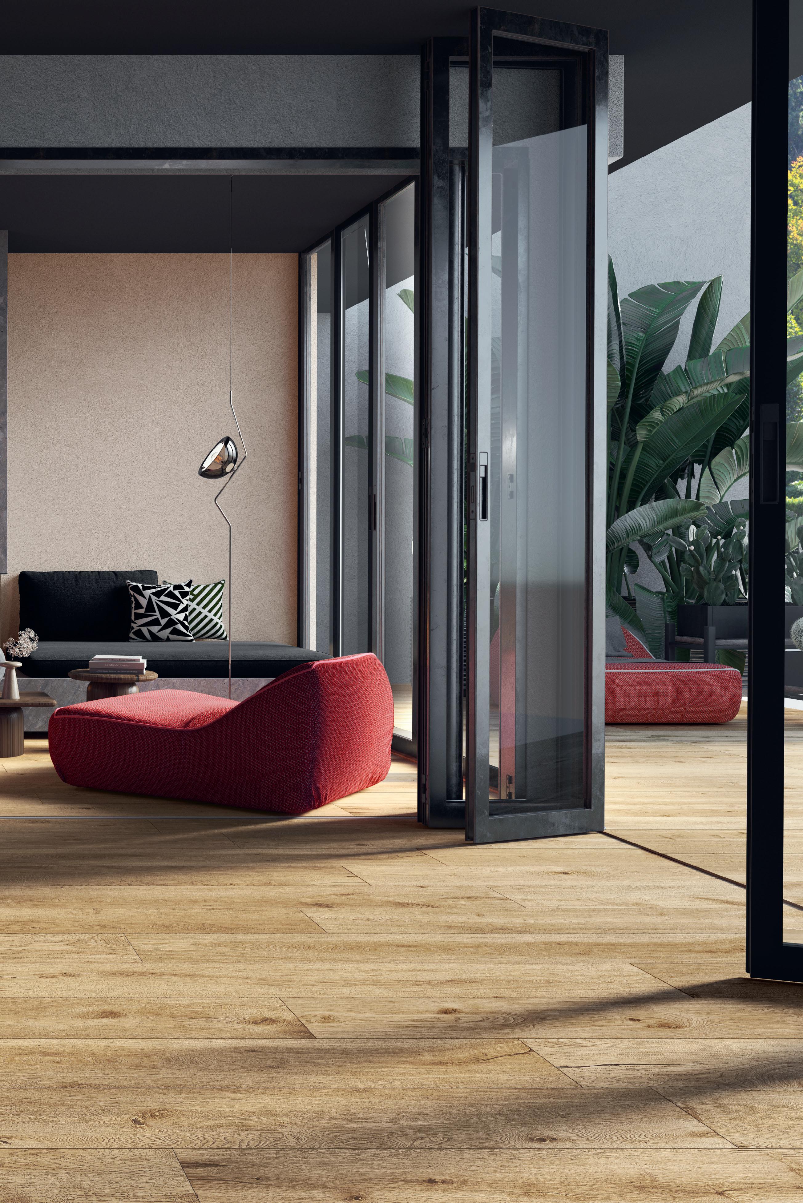 Wood Plank captures the rustic natural look of oak, integrating it in a functional, contemporary, and aesthetically captivating ceramic project. Knots, variations in grain, and filled cracks come together harmoniously in precise graphic patterns that convey a profound sense of authenticity. Both glamorous and genuine, the complex visual and tactile details of this wood-look product evoke the atmospheres of the most sophisticated and modern alpine retreats