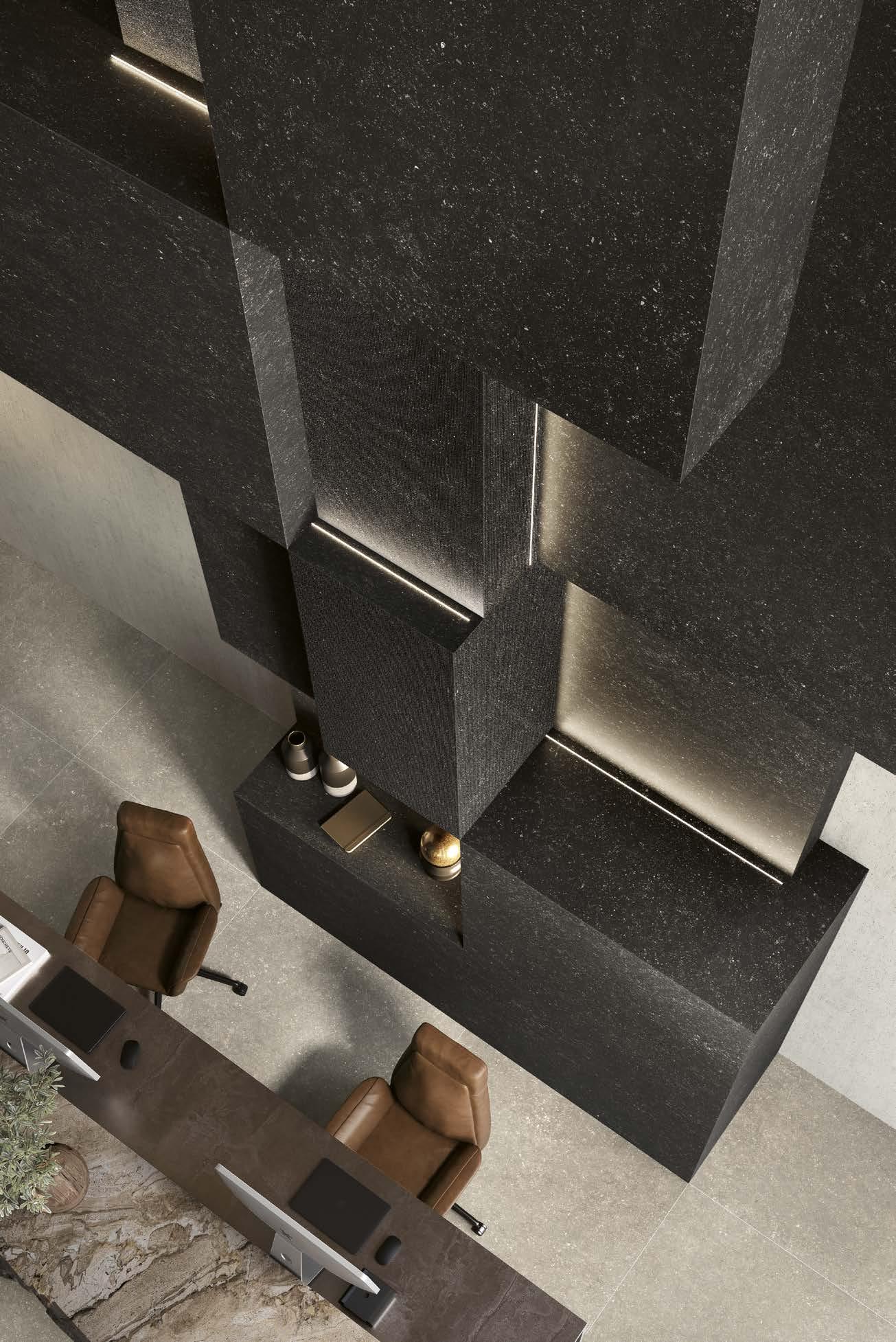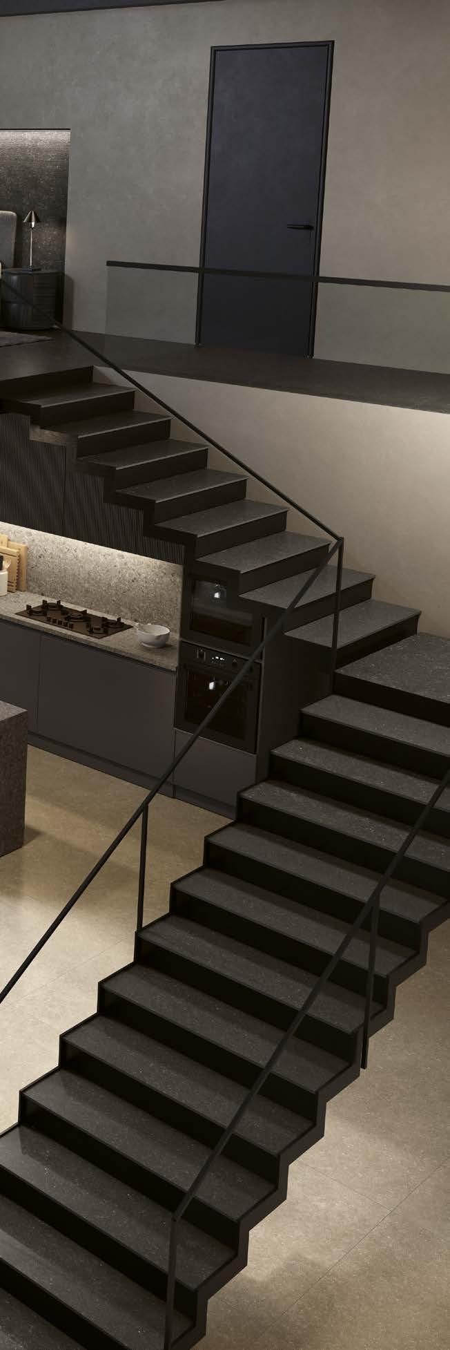 PIANO RIALZATO E SCALE_MEZZANINE FLOOR AND STAIRS: Pavimento e scale_Floor and stairs: ORIGIN BLACK HONED 90x90|36”x36” - 30x120|12”x48” Rivestimento_wall: ORIGIN BLACK STRIPES 60x120|24”x48” 15