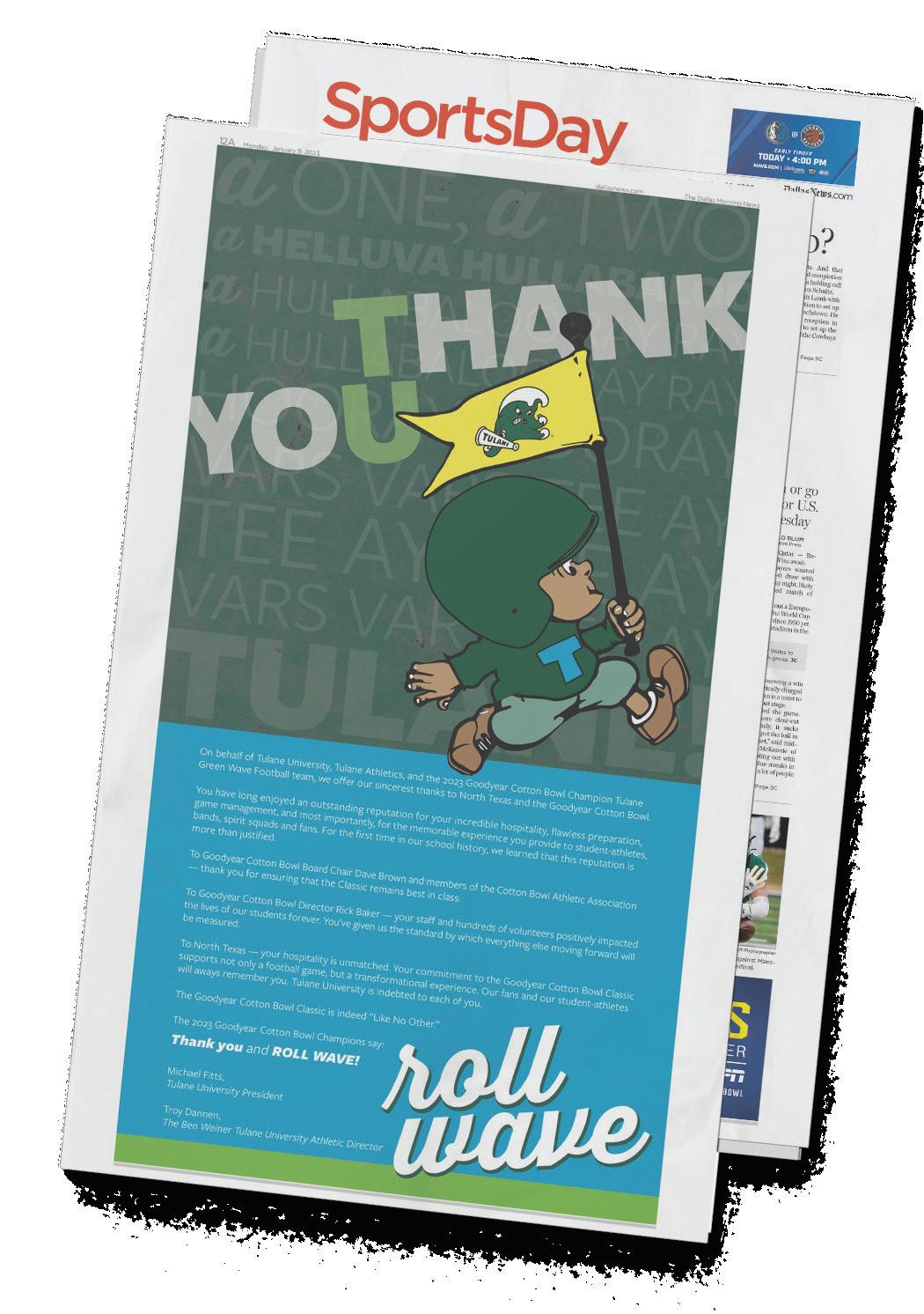This is a huge win for the program. Huge win for the university. Huge win for the city. What a game! I’ve said it 20 times, Cotton Bowl people are just fantastic. They treated us like kings all week. So thank you all for what you have done, and we’re just all so proud to represent Tulane University.