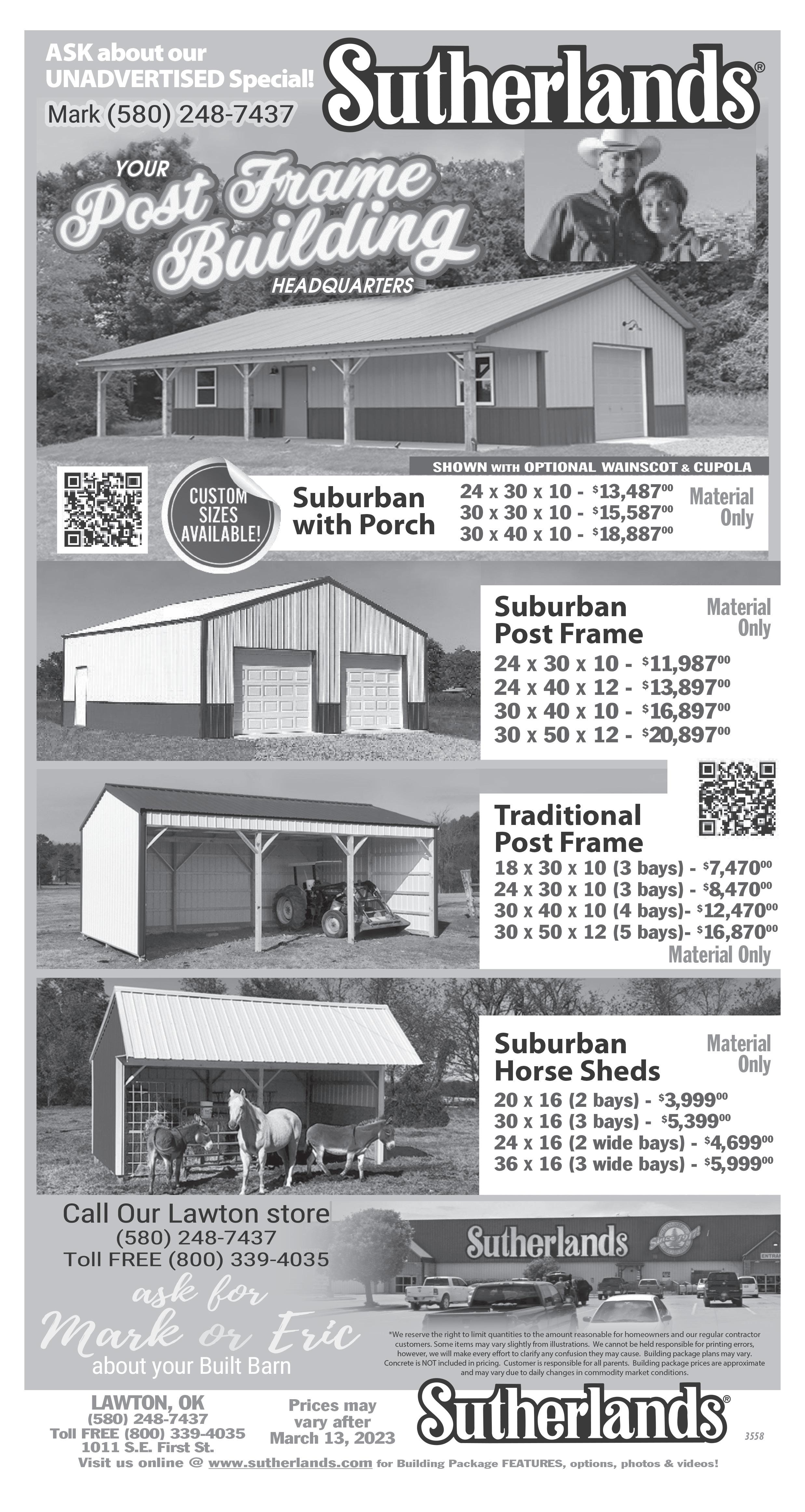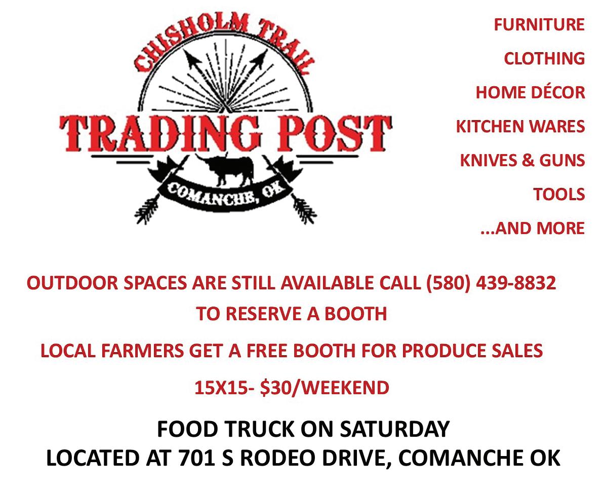 BARKER’S Trailer Parts Cache, OK 580-429-3822 Jimmy Barker, Owner Garcia’s Fencing PIPE BARBED WIRE CORRALS GATES ETC. PANCHO GARCIA (580) 736-0583 (580) 467-7622 401 School Rd. - Temple, OK (855) 212-5809 Newly Remodeled, 1, 2 or 3 Bedroom Apartments Extra Storage, Central H&A, Stove & Refrigerator, Carpet & Mini Blinds, Washer/Dryer Hookups & On-Site Laundry. Rental Assistance HUD Section 8 Accepted. This institution is an equal opportunity provider & employer. Apartment Homes TDD 711 ParkVillagePlaza Sunday-Thursday: 11:00 am to 9:00 pm Friday & Saturday: 11:00 am to 10:00 pm 401 E. James, Sterling, OK (580) 215-4762 2 or 3 Bedroom Apartments Central Heat & Air, Stove & Refrigerator, Carpet & Mini Blinds, On-Site Laundry. Rental Assistance available for qualified applications HUD Section 8 Accepted. This institution is an equal opportunity provider & employer. Apartments TDD 711 Sterling Village 505 N. 5th - Rush Springs, OK (580) 476-2655 Contact Julie Tuesday & Thursday : 8am - 12pm TDD 711 RUSH CREEK VILLAGE Apartments 1, 2 and 3 Bedroom Apartments Available For Rent. CHA, carpet & mini blinds, stove & refridgerator, washer/dryer hookups, laundry facility & playground on site. Rental assistance available for qualified applicants. HUD Section 8 Accepted (580) 755-0265 (940) 447-3600 REDRIVERGARAGEDOORSLLC@GMAIL.COM (580) 755-0265 (940) 447-3600 REDRIVERGARAGEDOORSLLC@GMAIL.COM FREE QUOTES LIKE US ON FACEBOOK FREE QUOTES LIKE US ON FACEBOOK Lawton Farmers Market Saturdays 8:00 a.m.-1:00 p.m. 77 SW 4th St. A year-round market located in the heart of downtown Lawton, Oklahoma. For vendor inquiries please call: Cindy Nocton (580) 678-9472 LawtonFarmersMarket.com Turkey Terrace RV Park Turkey Terrace RV Park 2909 S Whaley Rd 2909 S Whaley Rd Marlow, OK Marlow, OK 580-721-0403 580-721-0403