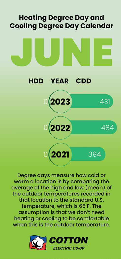 2023 2022 Total Amount Billed/Accrued $6,038,445 $7,131,290 Cost of Purchased Power 4,034,898 5,331,522 Taxes 106,792 116,114 Total Operating Expense Per Mile 1,173 1,327 Average Farm and Residential Bill 130 156 Average Farm and Residential kWh 981 1,138 Total Meters Billed (farm, residential) 19,456 19,240 Miles Energized 5,260 5,229 Density Per Mile 3.70 3.68 New Service Connects YTD 195 193 Services Retired 86 52 Published Monthly at Walters, Oklahoma By Cotton Electric Cooperative, Inc. Jennifer Meason CEO Shane Bowers Vice President Zach Young Director Carli Eubank Communications Specialist Cotton Electric Cooperative, Inc. Board of Trustees Shan Files, Velma, President Brian DeMarcus, Meers, Vice President Steven R. Robinson, Cache, Sec./Treas. Tony High, Walters, Asst. Sec./Treas. Ken Layn, Marlow Clifford Dunham, Chattanooga Todd Clark, Duncan Nichole Scott, Central High Dell Farris, Comanche “Cotton Electric Current” (USPS #134-020) is published monthly by: Cotton Electric Co-op, 226 North Broadway, Walters, OK 73572 Periodicals Postage paid at Lawton, OK 73501-4649 Postmaster Send #3579 To The Cotton Current 226 North Broadway Walters, OK 73572 This institution is an equal opportunity provider & employer. The Current Upcoming Deadlines for The Current