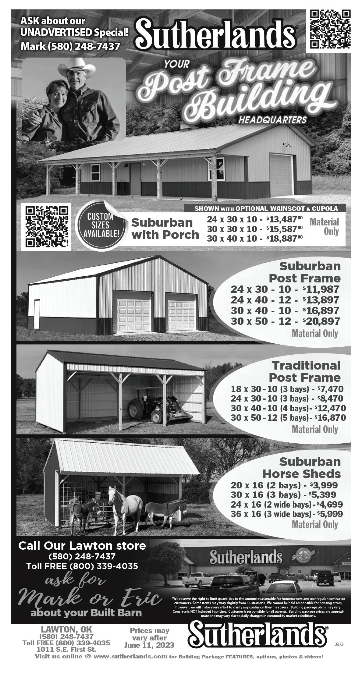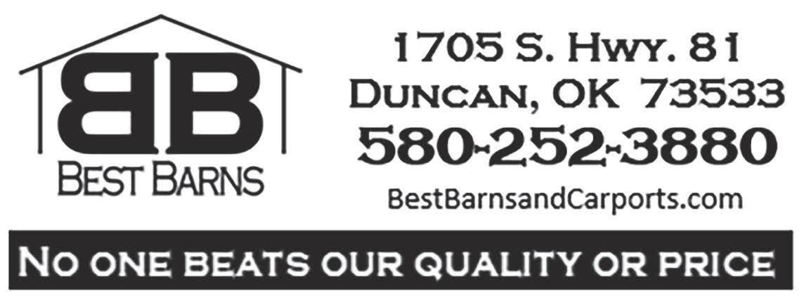 Page 16 Current Classifieds May 8, 2023 WWW.DARBYSFURNITURE.COM COMMISSION FREE SALES STAFF (First Responder and Military Discounts) EARNHART AUTOMOTIVE AND TRUCK PARTS, INC. 580-470-0570 2297 N HWY 81 Duncan, OK 73533 Hours: Mon - Fri, 8 - 5:30 Saturday, 8 - 2:00 Sunday, Closed • Automotive/Truck • Heavy Truck • Hoses (Hydraulic & A/C) • Paint and Body COME SEE US FOR ALL OF YOUR NEEDS! westerncommissioncompany.com OKLAHOMA CITY Mon/Tues 8am Ben I. Hale 405.235.8908 940.631.2333 COMANCHE Wednesday 9am Peyton D. Hale 580.439.8865 817.888.0657 Visit us on Facebook for weekly Market Reports Stop by our display yard at Land Pros in Duncan, across from the Stephens County Fairgrounds on South Hwy 81. Let us design and price your custom building. Come by, call or e-mail for a free quote! Carports, Garages, Barns, Metal Buildings BestBarnsandCarports.office@gmail.com 7758 US-277, Elgin, OK 73538 (580) 454-1756 Ready for a new opportunity? We’re hiring! We have several open positions. APPLY TODAY! For full job descriptions, deadlines and applications see www.greatplains.edu/jobs Great Plains is an Equal Opportunity Employer. General Help Wanted Cotton Electric_Layout 1 3/1/2023 3:12 PM Page 1 SHOWMAN’S CHOICE FOR ALL YOUR HORSE TACK & SHOW SUPPLY NEEDS. HOURS MON-FRI 8:00-5:30 SAT 10:00-2:00 1205 SW SHERIDAN RD LAWTON, OK 73505 580-355-7469 FIND US ON FACEBOOK! HOLT ELECTRIC Over 30 yEARS eXPERIENCE Residential Commercial Industrial Estimates Remodeling New Construction 24 hour Service 580-365-4147 P.O. Box 131 * Sterling OK 73567*Lic#OK10531 Brandon Smiley 580.251.1215 redlinetrailersandmore@gmail.com Duncan, OK Stock • Utility • Dump • Equipment • Tilt Free trailer lock with purchase of a trailer! Need to make a payment by phone? Call our automated system at 1-855-730-8711 Have your Cotton Electric account number and credit card or banking account numbers ready before making the call.