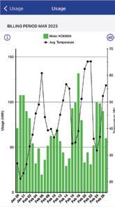 Another feature in Usage is a comparison of daily energy consumption to average temperature. This is shown on a bar graph overlaid with high, low and/or average temperatures. This illustrates the increase in electricity use during extremely hot or cold weather. Energy use thresholds can be set to notify members when they are using more energy than they would like and help them keep bills as low as possible.