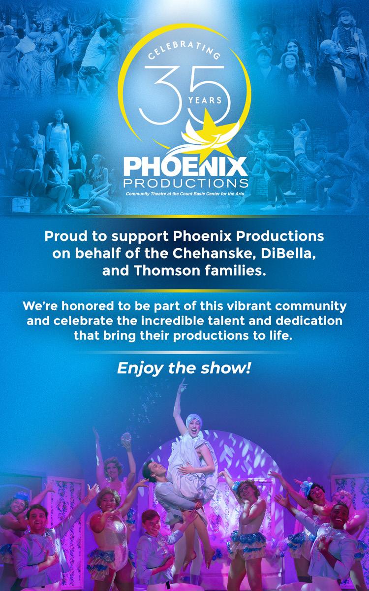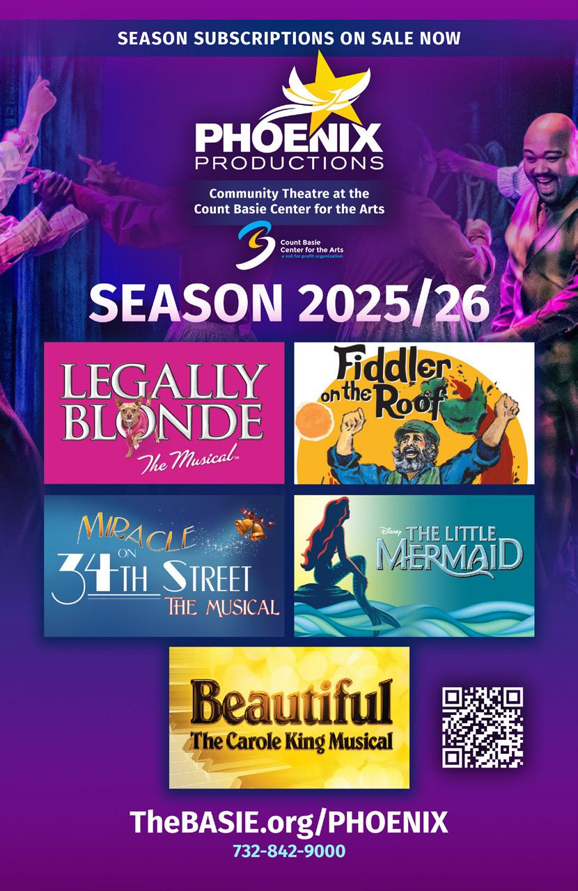 (Director; Properties; Managing Artistic Director) has directed several productions for Phoenix at the Count Basie Center for the Arts, including: Fiddler on the Roof, The Full Monty, Miss Saigon, Jesus Christ Superstar, Tommy, The 30th Anniversary Gala Concert, The Hunchback of Notre Dame, Songs for a New World, Smokey Joe’s Café, Spring Awakening, Elf, Putting It Together, Evil Dead The Musical, American Idiot, The Music Man, and Bat Boy: The Musical. He continues to direct and perform other places as time allows. As always, for Olivia.