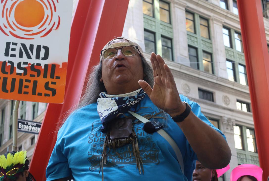 Juan Mancias, Chief, Carrizo/Comecrudo Tribe of Texas speaking in front of the Chubb Insurance office.