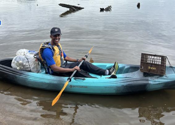 On the Potomac river collecting trash with other volunteers using kayaks.