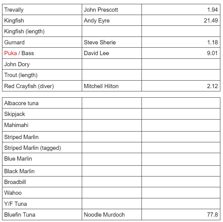 22 LeaderBoard Weighmaster contacts SteveWatts021 033514509235002ClintHunt 02108097284 ScottWarrender021626076 PeteSellers 0210412943 SarahParkinson021669944 LENGTHRECORDS we needaclearphoto of the fish on the approvedmeasure,which areavailable for $25.The photo mustbe ofthe wholefish lyingonitsside with themouth touchingtheheadof themeasure. We will need detailsof whereitwas caughtand the nameof theangler.