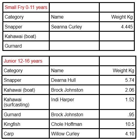 Inthesecondaryschoolfunnyphoto sectionBrockJohnstongotfirstplace with“stillfishing”andReganDicksongot thirdplacewith“burleypotfishing”.In theprimaryagegroupIndiHarpergot secondplaceinthelivemarinesection with“channelmarker”andJakeHarper gotsecondplaceinthefunnyphoto sectionwith“westiemullet”.Agreat effortfromeveryone,greattoseeour youngermembersouttherefishingand alsohavingfun.
