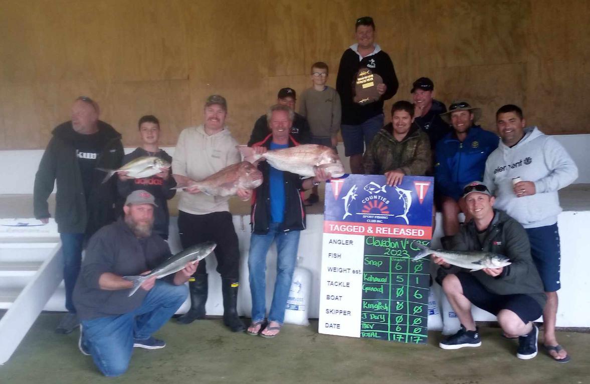 This competition is held every year between Counties and Clevedon game fishing clubs. It is held over two days (Saturday and Sunday) with the weigh in on Sunday afternoon. Each year the clubs take it in turns to host the event, this year Clevedon are hosting. The host club lays on food, and there is always a good spread on offer. Teams score points for the heaviest three fish in 6 categories; Snapper, John Dory, Kahawai, Kingfish, Gurnard and Trevally. Three points for heaviest, two points for second and one point for third. The points are totalled and the winning team decided. Those with a long memory will remember that we have won this competition, but the last few years have not gone well for us and Clevedon have had some pretty decisive wins. Counties honour is at stake and we would really like to beat them this year, so if you can please think about taking part in the competition. As you can see from this picture of last years competition everyone had a great time, although Clevedon do seem to be smiling more than we are.