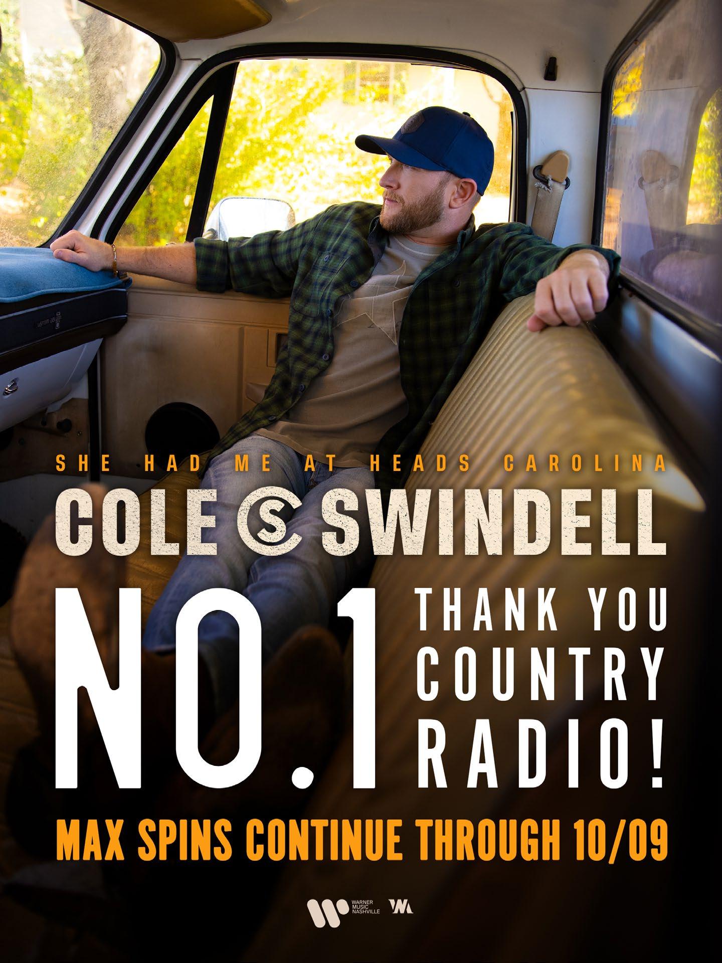 Congratulations to Cole Swindell, Kristen Williams, Tom Martens, Anna Cage and the Warner/WMN promotion team on landing “She Had Me At Heads Carolina” at No. 1, becoming