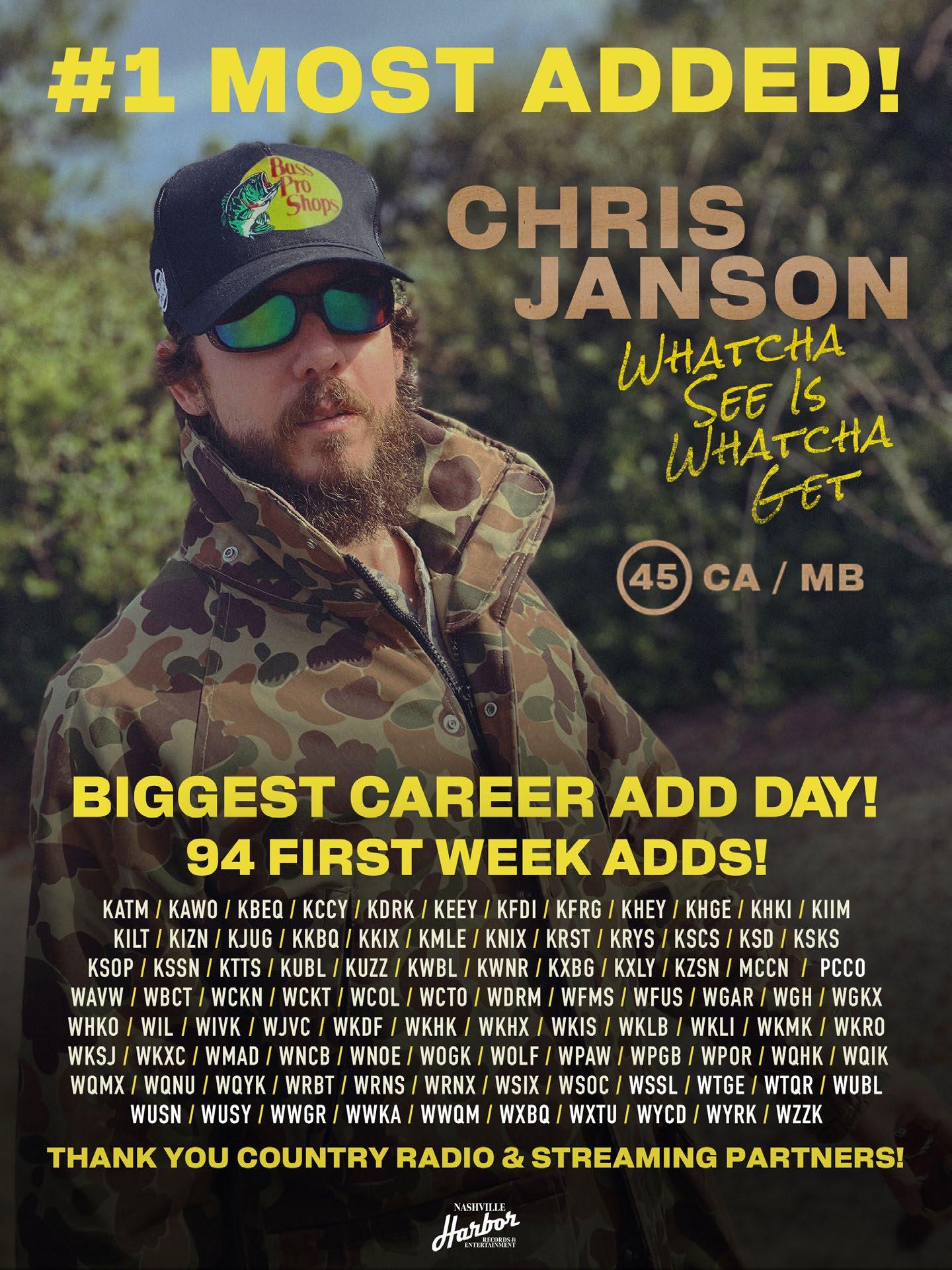 Kudos to Ryan Dokke and the Nashville Harbor crew on leading this week’s CA/MB Add Board with 94 adds for Chris Janson’s “Whatcha See Is Whatcha Get.” His seventh Add Board leader, this is Janson’s largest add week ever, eclipsing the 75 recorded by “All I Need Is You” in February 2023.