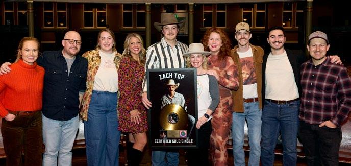 Dirt Turns To Gold: Leo33’s Zach Top celebrates his first gold single, ”I Never Lie,” with his label team at Nashville Pictured (l-r) are Ailie Birchfield, Chris Fabiani, Tracy Gibson, Top, Katie Dean, Natalie Osborne Joseph Manzo and Daniel Lee