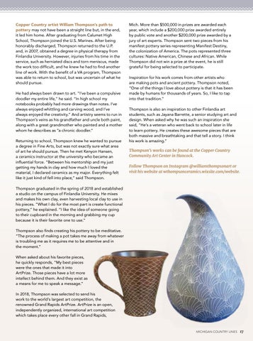 Mich. More than $500,000 in prizes are awarded each year, which include a $200,000 prize awarded entirely by public vote and another $200,000 prize awarded by a jury of art experts. Thompson sent two pieces from his manifest pottery series representing Manifest Destiny, the colonization of America. The pots represented three cultures: Native American, Chinese and African. While Thompson did not win a prize at the event, he is still grateful for being selected to participate. Inspiration for his work comes from other artists who are making pots and ancient pottery. Thompson noted, “One of the things I love about pottery is that it has been made by humans for thousands of years. So, I like to tap into that tradition.” Thompson is also an inspiration to other Finlandia art students, such as Jayana Barrette, a senior studying art and design. When asked why he was such an inspiration she said, “He’s a veteran who went back to school later in life to learn pottery. He creates these awesome pieces that are both massive and breathtaking and that tell a story. I think his work is amazing.” Thompson’s works can be found at the Copper Country Community Art Center in Hancock. Follow Thompson on Instagram @williamthompsonart or visit his website at wthompsonceramics.wixsite.com/website.