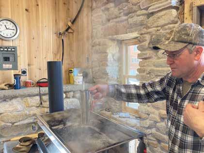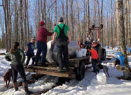 They currently tap approximately 500 trees on 120 acres, walking from tree to tree and collecting sap in fivegallon pails and using a tractor and a 400-gallon milk tank to transport the sap to the shack. Hope maintains a “tap map” to show which trees were tapped each year. On a good day, they will fill the tank two or three times with raw sap. Once placed in the evaporator, it can take up to two days to produce the first batch of syrup.