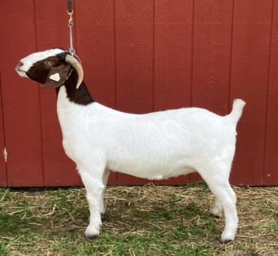 Wether doe. Comes from one of our best bloodlines, which has produced a number of champion wethers. Produces kids with a big top and a great front. Bred to Traffic Jam (Tucker's Pickup Man son). Will be confirmed by sale day.