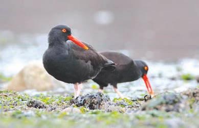 the coast when I started volunteering for the Bird Alliance of Oregon and US Fish and Wildlife Service as a black oystercatcher nest monitor. This elusive bird spends its time near Pacific NW rocky shores, returning to the same familiar rocks with its lifelong partner to nest each summer. Both males and females are completely black, except for distinctly orange eyes and bills. Their unique call often alerts you to their presence, beginning as a high peeping sound that descends in pitch like a moving train. In spite of their name, black oystercatchers prefer mussels and other mollusks to oysters, and are often seen foraging at the tidal zone of rocks.