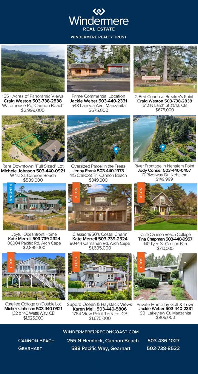 April 28, 2023 2 CannonBeachGazette.com | Cannon Beach Gazette MULTI-USE CANNON BEACH COMMERCIAL PROPERTY $3,150,000 OCEANFRONT HOME ON (2) OCEANFRONT TAX LOTS $2,999,500 CANNON BEACH OCEAN VIEW HOME $1,799,000 PERFECT WEST GEARHART LOCATION NEAR GOLF COURSE $525,000 Michael HendersonManaging Principal Broker Jeremy YoungquistBroker Liqaa RansierBroker Duane Johnson - Founder Jeff EtchisonPrincipal Broker, GRI Chris ChildressPrincipal Broker, GRI H21961 ELEGANT, OCEAN VIEW BEACH HOME $2,795,000 SOLD NEW LISTING 1/12TH SHARE OWNERSHIP OCEAN VIEW CONDO $85,000 NEW LISTING BEAUTIFUL 4.1 ACRE PARCEL WITH STUNNING PANORAMIC OCEANVIEWS! $4,495,000 VACANT CANNON BEACH LOT, ZONED R3 $389,500 SALE PENDING SALE PENDING CANNON BEACH E PRESIDENTIAL 2 SEPARATE LIVING QUARTERS $949,000 VACANT