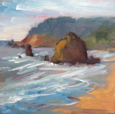 A painting by Schlessinger depicting Cannon Beach’s famous Haystack Rock