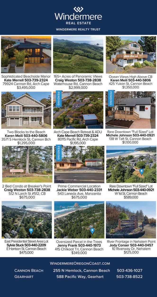 June 23, 2023 2 CANNONBEACHGAZETTE.COM | CANNON BEACH GAZETTE MULTI-USE CANNON BEACH COMMERCIAL PROPERTY $3,150,000 OCEANFRONT HOME ON (2) OCEANFRONT TAX LOTS $2,999,500 CANNON BEACH OCEAN VIEW HOME $1,750,000 PERFECT WEST GEARHART LOCATION NEAR GOLF COURSE $525,000 Michael HendersonManaging Principal Broker Introducing Reid Peterson to the Duane Johnson family Jeremy YoungquistBroker Duane Johnson - Founder H22236 ELEGANT, OCEAN VIEW BEACH HOME $2,795,000 SOLD BEAUTIFUL 4.1 ACRE PARCEL WITH STUNNING PANORAMIC OCEANVIEWS! $4,495,000 CANNON BEACH E PRESIDENTIAL 2 SEPARATE LIVING QUARTERS $949,000 1/12TH SHARE OWNERSHIP 3 BED 2 BATH CONDO $99,000 What is RMLS? As the Northwest’s largest REALTOR®-owned Multiple Listing Service(MLS), RMLS serves approximately 10,000 Real Estate Professionals in over 2,200 offices licensed in Oregon and Washington. All brokers listed with firm are licensed in the state of Oregon 296 N. Spruce St. • Cannon Beach • (503) 436-0451 www.duanejohnson.com Active Members of & A VALUED AND TRUSTED RESOURCE WITHIN OUR COMMUNITY AND THE #1 OFFICE SINCE 1990. BEAUTIFUL ARCH CAPE CUSTOM HOME ON OVERSIZED LOT $929,000 SALE PENDING VACANT CANNON BEACH LOT, ZONED R3 $389,500 SOLD SOLD 1/12TH SHARE OWNERSHIP OCEAN VIEW CONDO $85,000 SOLD NEW PRICE NEW LISTING H22202 Sat., Aug. 26 & Sun., Aug 27 Regular vendors $50 • Food vendors $150 Bay City Pearl & Oyster Music Festival Call for Vendors If interested contact Patty Watson 503-201-9912 or Beverly Anderson 503-300-9013 instagram.com/pearlandoystermusicfestival
