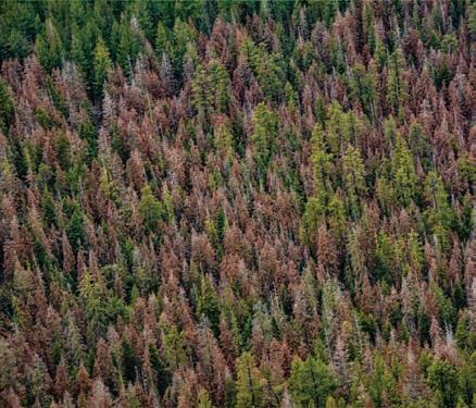 spring and fall months. With warmer winter temperatures, more precipitation falls as rain instead of snow at low and mid-elevations, with warmer spring weather causing the snowpack to melt earlier in the season. High elevation snowpack that used to release water well into July is now melting earlier, resulting in less water for trees during the hot, dry summer months. Drought years in the Pacific Northwest that used to occur once or twice a decade are now happening five or six times within a decade. It can take several years for some tree species to recover from an extremely dry year, and one or two wet years following a drought may not be enough for them to fully recover before the next dry spell hits. Climate change is a chronic stressor on trees, making them much more susceptible to large outbreaks of disease and insects.