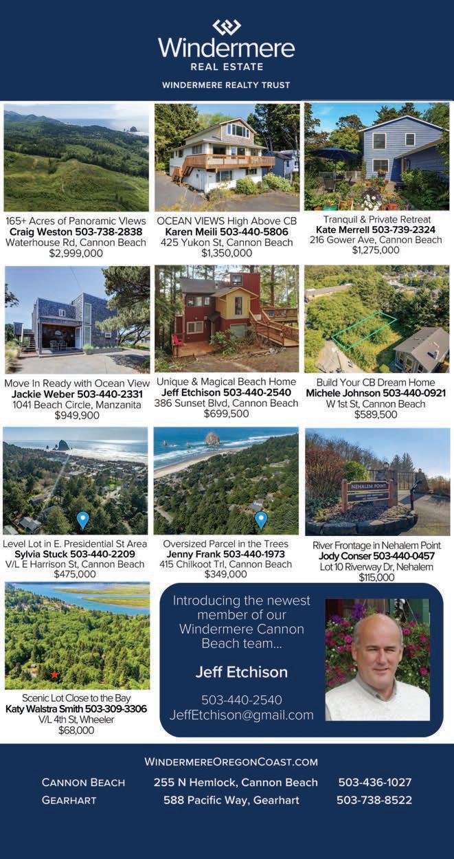 July 21, 2023 A2 CANNONBEACHGAZETTE.COM | CANNON BEACH GAZETTE CANNON MULTI-USE CANNON BEACH COMMERCIAL PROPERTY $3,150,000 OCEANFRONT HOME ON (2) OCEANFRONT TAX LOTS $2,999,500 CANNON BEACH OCEAN VIEW HOME NEW PRICE $1,650,000 PERFECT WEST GEARHART LOCATION NEAR GOLF COURSE $525,000 Michael HendersonManaging Principal Broker Reid PetersonBroker Jeremy YoungquistBroker Duane Johnson - Founder H22353 ELEGANT, OCEAN VIEW BEACH HOME $2,795,000 SOLD BEAUTIFUL 4.1 ACRE PARCEL WITH STUNNING PANORAMIC OCEANVIEWS! $3,999,000 CANNON BEACH E PRESIDENTIAL 2 SEPARATE LIVING QUARTERS $949,000 W. PRESIDENTIAL. 2 BLOCKS TO DOWNTOWN & JUST 2 HOUSES FROM THE BEACH $2,459,500 1/12TH SHARE OWNERSHIP 3 BED 2 BATH CONDO $99,000 What is RMLS? As the Northwest’s largest REALTOR®-owned Multiple Listing Service(MLS), RMLS serves approximately 10,000 Real Estate Professionals in over 2,200 offices licensed in Oregon and Washington. All brokers listed with firm are licensed in the state of Oregon 296 N. Spruce St. • Cannon Beach • (503) 436-0451 www.duanejohnson.com Active Members of & A VALUED AND TRUSTED RESOURCE WITHIN OUR COMMUNITY AND THE #1 OFFICE SINCE 1990. BEAUTIFUL ARCH CAPE CUSTOM HOME ON OVERSIZED LOT $890,000 OPEN HOUSE Sat., July 22 • 11 a.m. to 2 p.m. SALE PENDING VACANT CANNON BEACH LOT, ZONED R3 $389,500 SOLD SOLD 1/12TH SHARE OWNERSHIP OCEAN VIEW CONDO $85,000 SOLD NEW PRICE SALE PENDING www.brucescandy.com • 503-436-2641 Freshest Homemade: Saltwater Taffy Chocolates Caramel Corn Making Sweet Memories for over 60 Sweet Years! H22352 The only saltwater taffy made in Cannon Beach! Downtown Cannon Beach Visit our online store and shop for Sweet Treats from Cannon Beach WE SHIP! EMPLOYEE OWNED. OREGON GROWN. EMPLOYEE OWNED. OREGON GROWN. Thank you for voting McKay’s! Best Produce Favorite Customer Service Favorite Food Store Like us on Facebook and Follow us on Instagram! www.mckaysmarket.com Serving our community for 74 years! EMPLOYEE OWNED. OREGON GROWN. EMPLOYEE OWNED. OREGON GROWN. Thank you for voting McKay’s! Best Produce Favorite Customer Service Favorite Food Store Like us on Facebook and Follow us on Instagram! www.mckaysmarket.com Serving our community for 74 years!