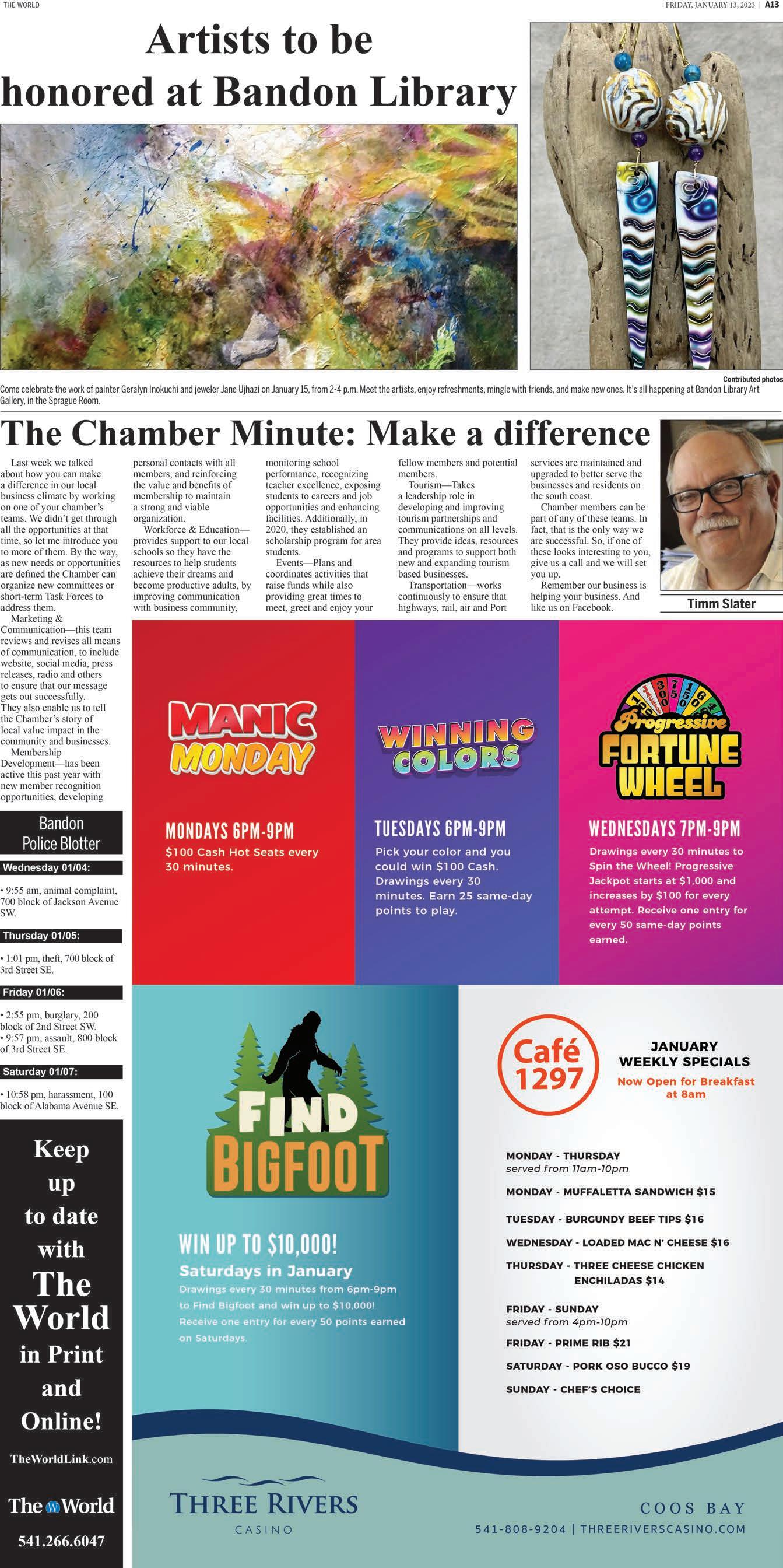 Welcome 2023! Serving Oregon’s South Coast since 1878 • A Country Media Newspaper • Copyright 2022 Follow us: facebook.com/theworldnewspapertwitter.com/TheWorldLinkinstagram.com/theworldlink FIND US ONLINE: TheWorldLink.com EMAIL US: WorldCirculation@CountryMedia.net CALL US: (541) 266-6047 Serving Oregon’s South Coast Since 1878 | FRIDAY, JANUARY 13, 2023 | theworldlink.com | $2 Serving Oregon’s South Coast Since 1878 Southern Coos Health Foundation's Quarterly Art Show See this story on page A2 Obituaries A4 Opinion A5 Police Blotter A16 Comics A7 Classifieds A11 Calendar A8