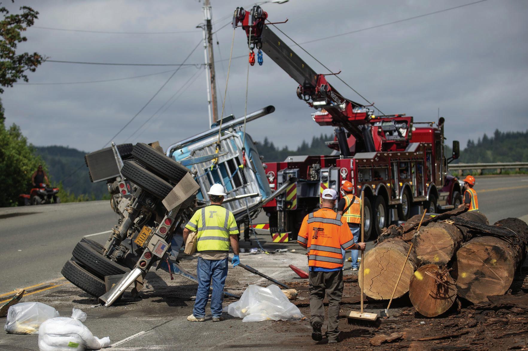 A Mast Brothers crew works to tow a semi that wrecked near Coos Bay. The city of Coos Bay will use Mast Brothers for all its towing needs after the city council denied an appeal over its decision to use only one company.