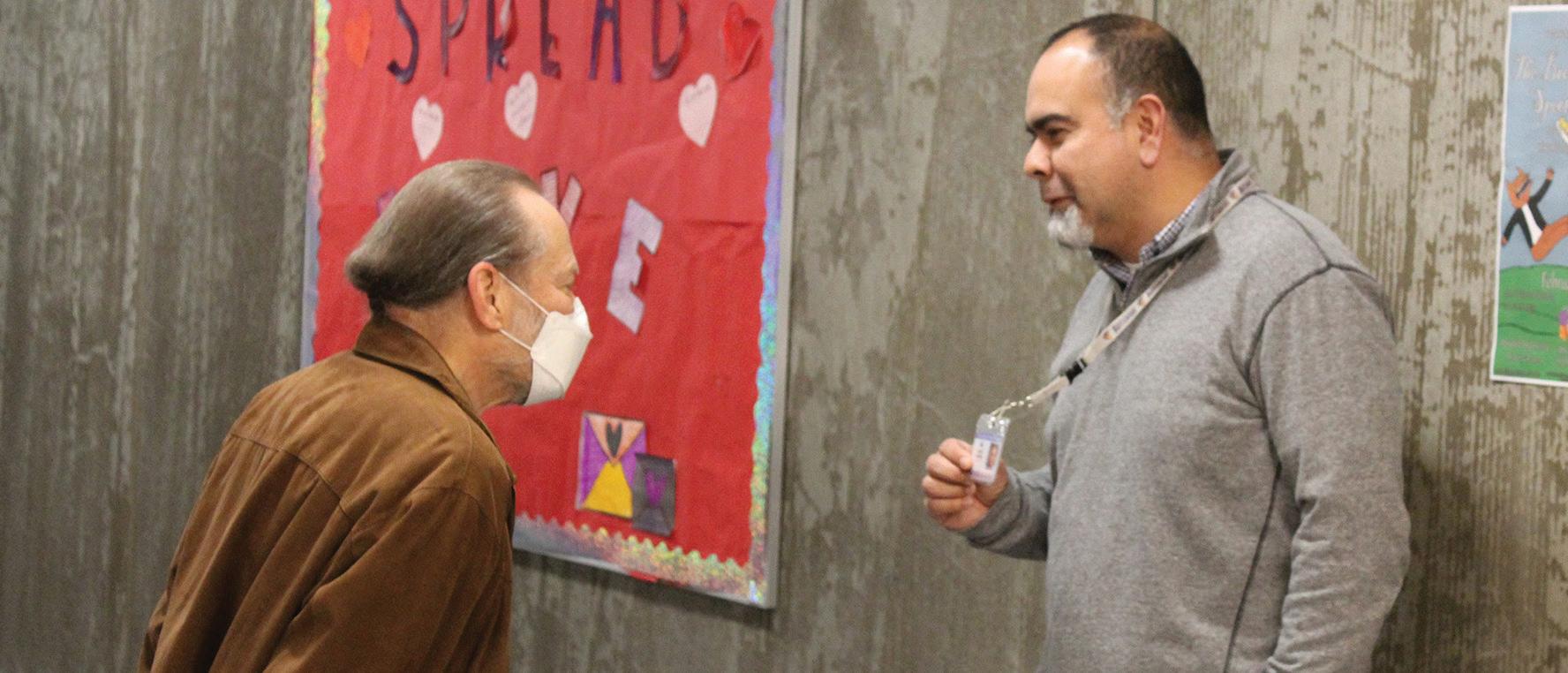 Coos Bay School Board Chair Kim Brick talks about Marshfield Junior High during an open house at the school. Below, Marshfield Junior High Principal Floyd Montiel discusses the new schools with a guest during the open house Wednesday.