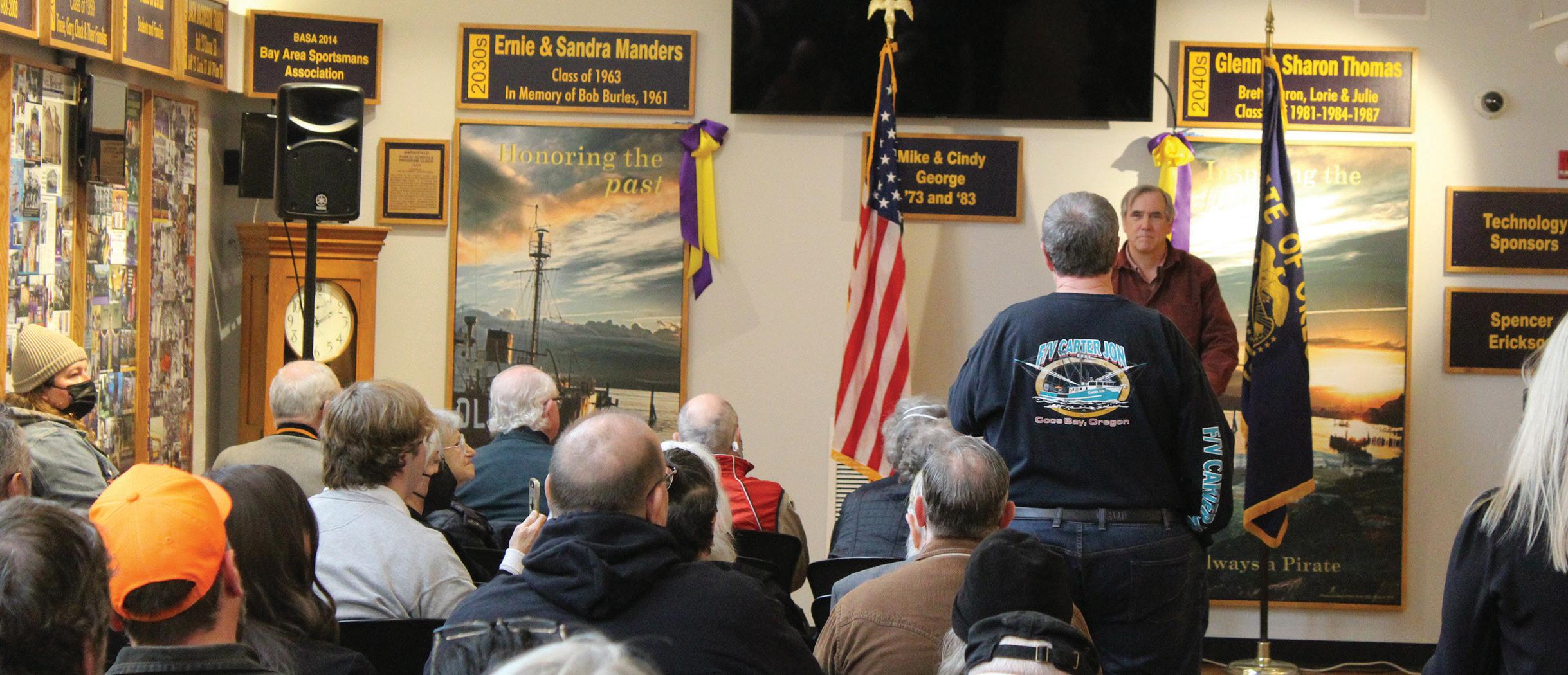 U.S. Senator Jeff Merkley, standing front, listens to a question from a commercial fisherman who was concerned that plans to bring offshore wind to the Oregon Coast could impact not only the fishing industry but the quality of life of those who live here. Merkley said he agreed with many of the concerns, adding he and his staff are working with the Bureau of Ocean Energy Management to come up with a solution that expands renewable energy while protecting commercial fishermen, the climate and those who live and recreate at the coast. Merkley discussed that issue and many more during a town hall at Heritage Hall on the campus of Marshfield High School. For a full recap, see the Friday edition of The World.